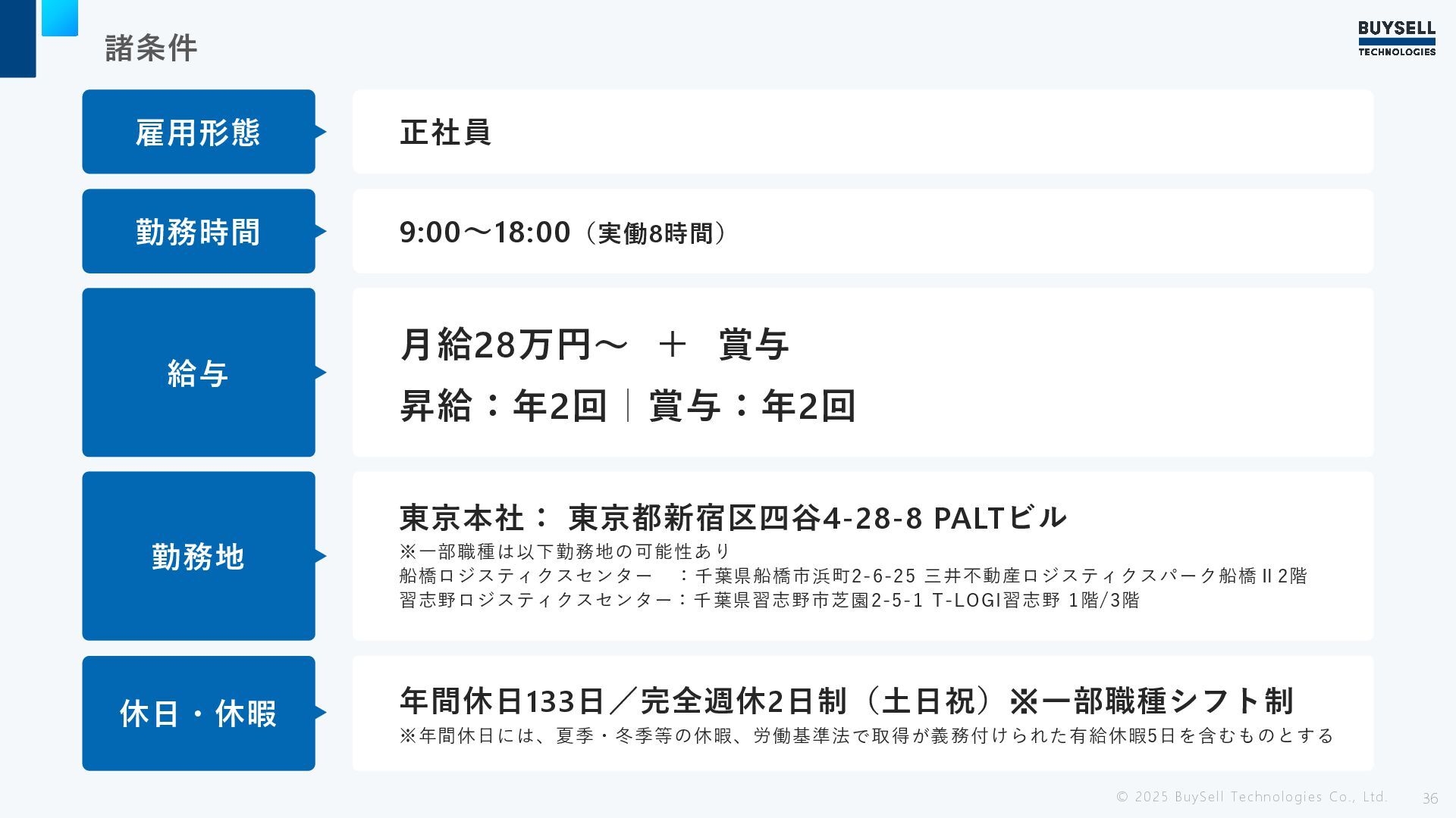 諸条件 © 2025 BuySell Technologies Co., Ltd. 36 休日・休暇 年間休日133日/完全週休2日制(土日祝)※一部職種シフト制