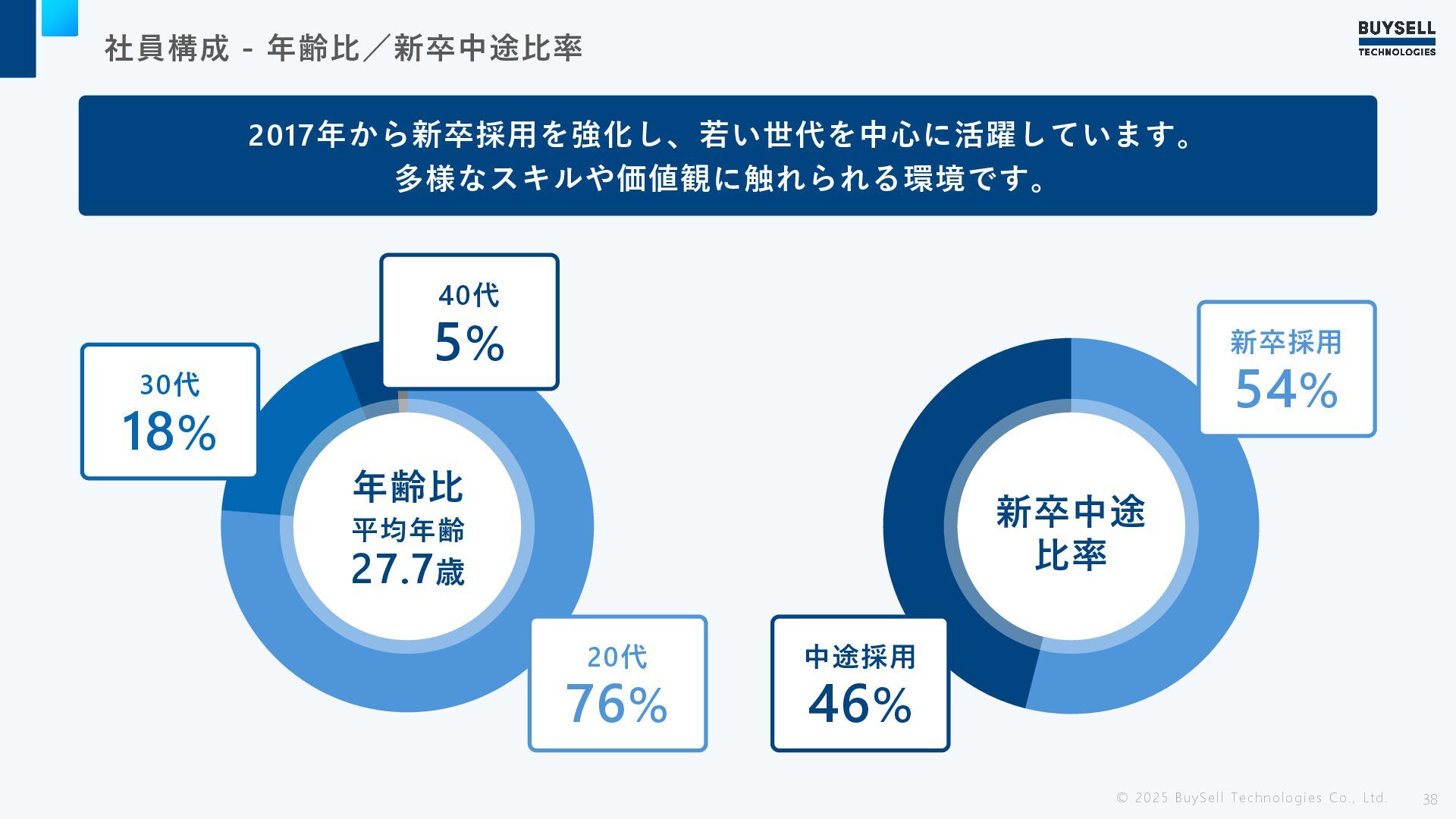 社員構成 - 年齢比/新卒中途比率 © 2025 BuySell Technologies Co., Ltd. 38