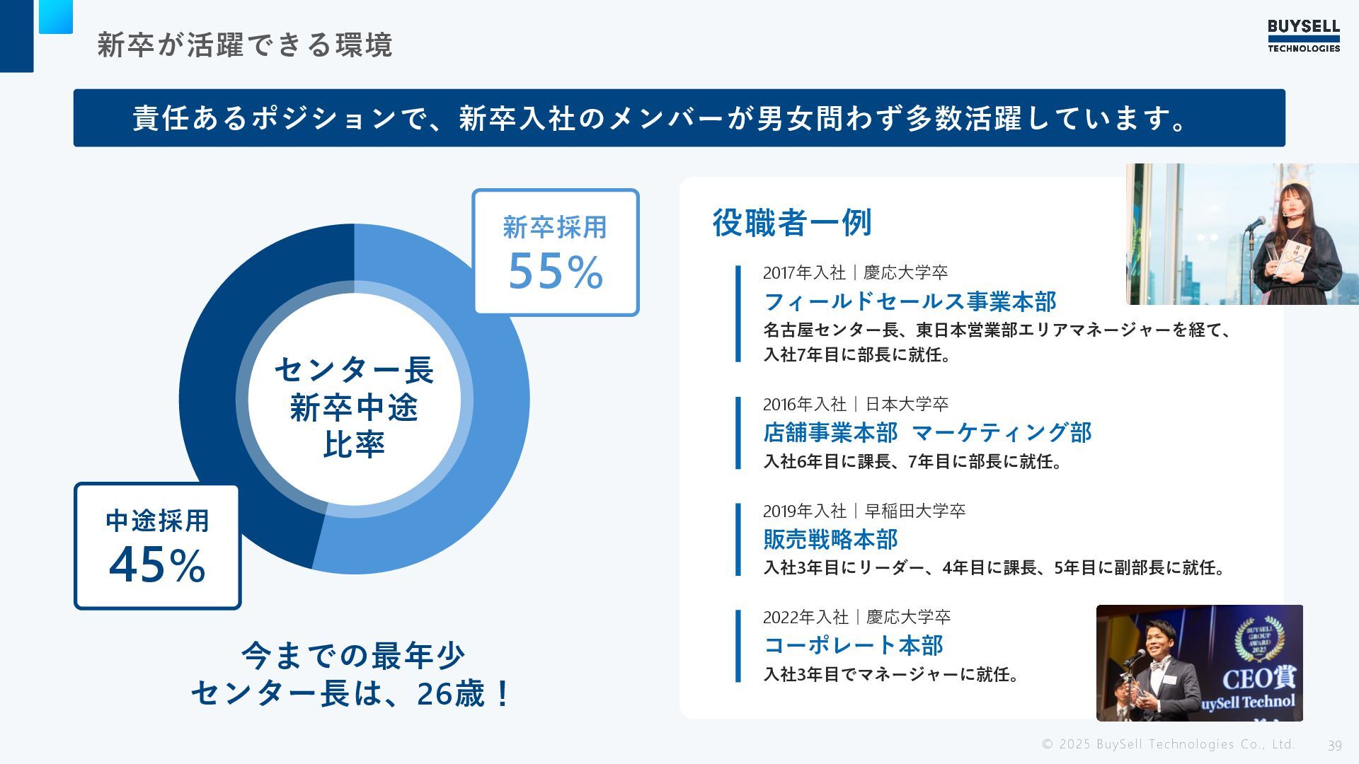 新卒が活躍できる環境 © 2025 BuySell Technologies Co., Ltd. 39 責任あるポジションで、新卒入社のメンバーが男女問わず多数活躍しています。 センター長