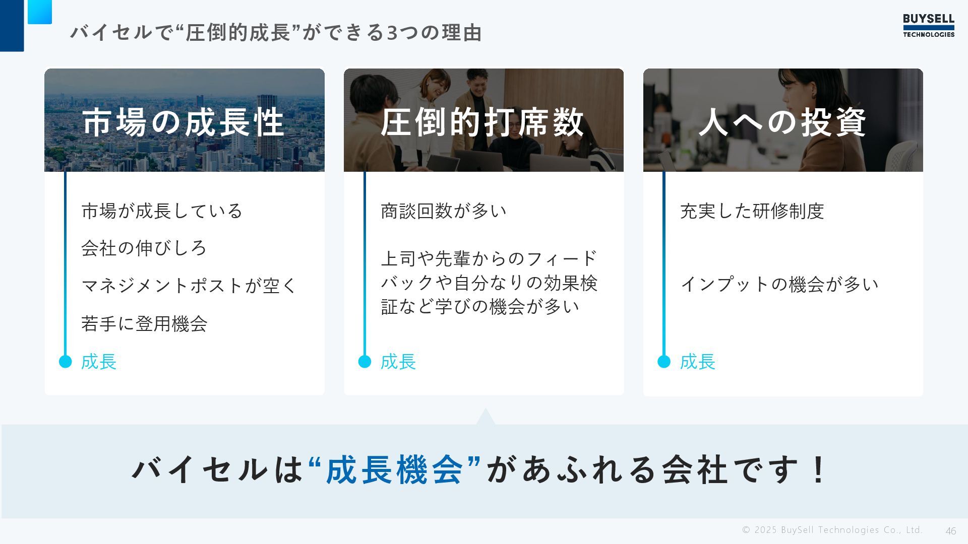 圧倒的打席数 人への投資 市場が成長している 会社の伸びしろ マネジメントポストが空く 若手に登用機会 成長 商談回数が多い 成長 充実した研修制度 成長 上司や先輩からのフィード バックや自分なりの効果検 証など学びの機会が多い インプットの機会が多い