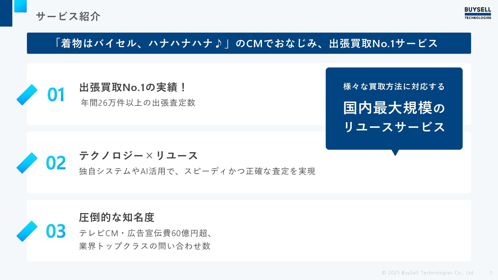 サービス紹介 © 2025 BuySell Technologies Co., Ltd. 6 お客様のニーズに合わせた様々な方法で、お買取。 自宅に眠るさまざまな不要なものを、誰かの必要なものへと変えています。