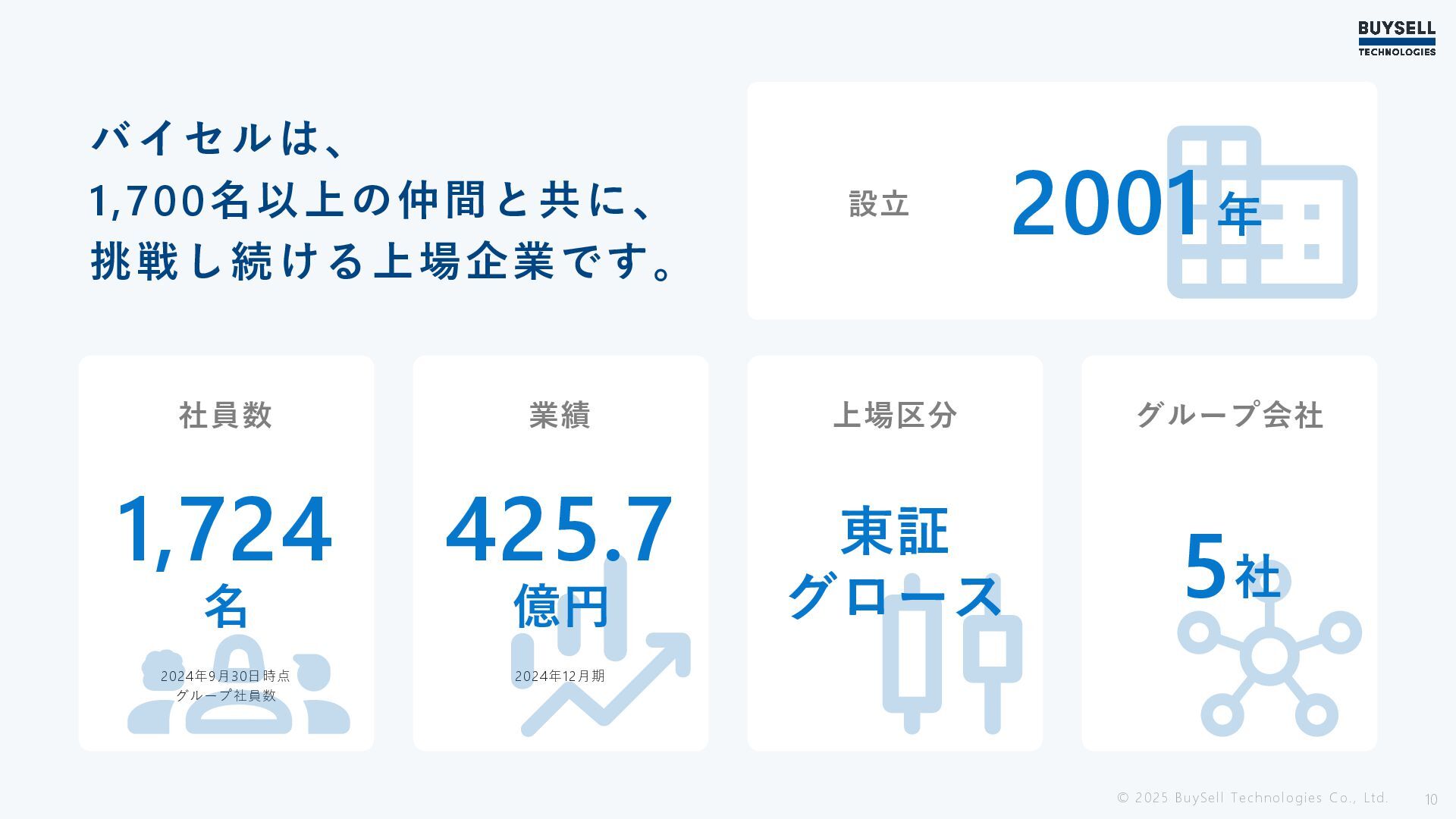 © 2025 BuySell Technologies Co., Ltd. 10 バイセルは、 1,700名以上の仲間と共に、 挑戦し続ける上場企業です。