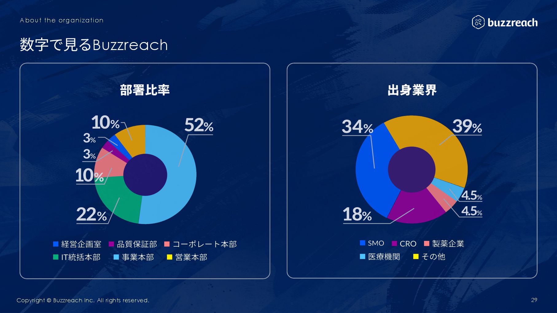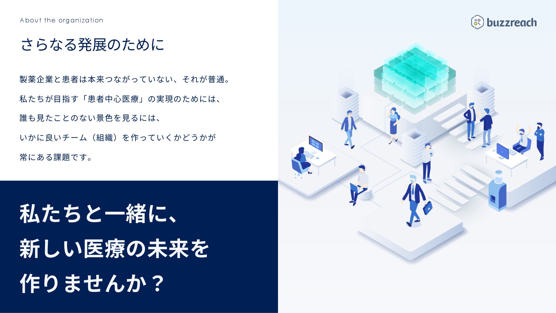 10〜15年で 約500億円 年800件の治験申請、 新薬開発の成功確率は 約23,000分の1* *出展:製薬協てきすとぶっく 2024-2025 60〜70%の治験で エントリー期間延⻑ 国内未承認薬の増加、 ドラッグラグから ドラッグロスへ 莫⼤な開発費と 時間がかかっている 成功確率は極めて低く、2つの 新薬の発売の影には22,406もの 失敗が積み重なっている 様々な課題によって 私達の⼿元に 届くのが遅れている 2010〜2020年の国内の 未承認薬265品⽬のうち、約7割が 国内では開発に動きがない。 ⽇本市場に⼊ってきさえしない 新薬が増える懸念も FACT 01 FACT 02 FACT 03 FACT 04 基礎研究 2〜3年 3〜5年 将来お薬となる可能性のある 物質を発⾒‧作製する ⾮臨床試験 培養細胞や動物を対象に 安全性‧有効性を調べる 臨床試験(治験) ヒトを対象に安全性‧ 有効性を調べる 安全性や有効性‧品質について 審議され、認可 3〜7年 1〜2年 承認申請 Buzzreachのビジョン 新薬開発期間10年を5年にする Who we are?