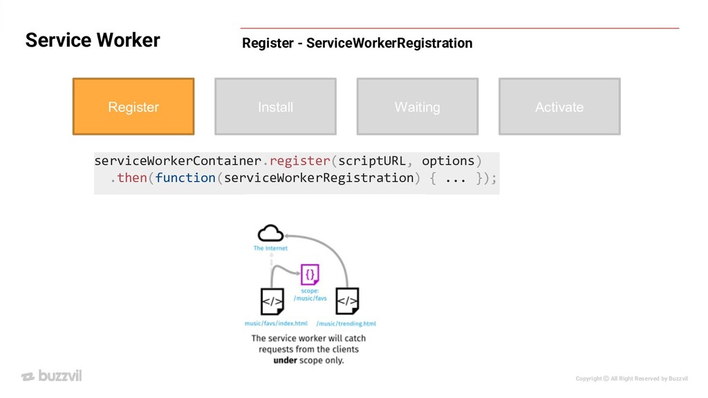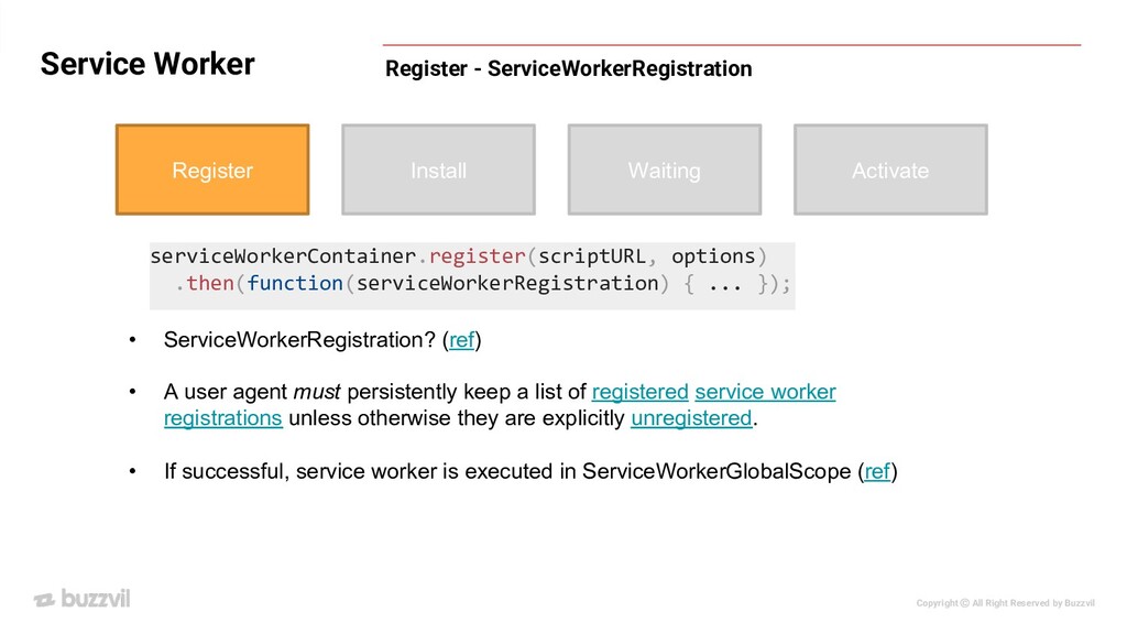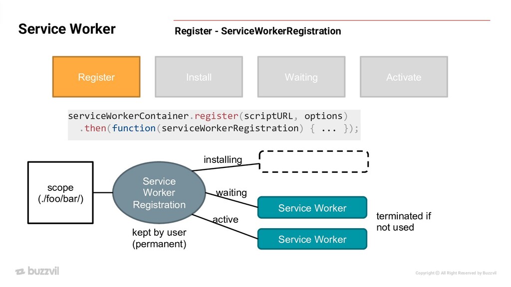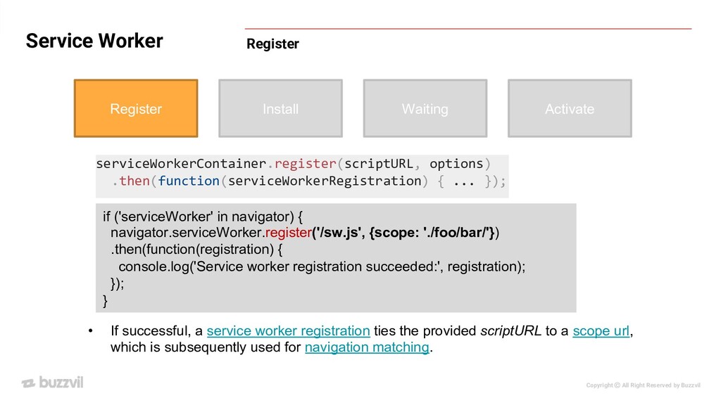Register Install Waiting Activate serviceWorkerContainer.register(scriptURL, options) .then(function(serviceWorkerRegistration) { ... }); • If successful, a service worker registration ties the provided scriptURL to a scope url, which is subsequently used for navigation matching. if ('serviceWorker' in navigator) { navigator.serviceWorker.register('/sw.js', {scope: './foo/bar/'}) .then(function(registration) { console.log('Service worker registration succeeded:', registration); }); }