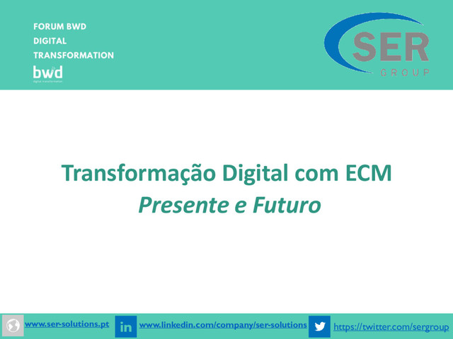 longa duração Expedientes Eletrónicos Solução eFolder universal, gestão de casos dinâmica Business Process Mgmt Processos de negócio desde ágeis, ad-hoc até altamente complexos Gestão Documental Templates, gestão versões, aprovação, anotações eletrónicas Soluções Mailroom Documentos em papel entrantes, processamento e gestão de faturas Integrações ECM para Office, SharePoint, SAP, Dynamics, Oracle e APIs genéricas