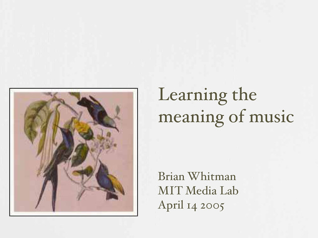 Keith, Michael Casey, Judy, Mike Mandel, Wei, Victor, John, Nyssim, Rebecca, Kristie, Tamara Hearn. Dan Ellis & Columbia; Adam Berenzweig, Ani Nenkova, Noemie Elhadad. Deb Roy. Ben Recht, Ryan Ri.in, Jason, Mary, Tristan, Rob A, Hugo S, Ryan McKinley, Aggelos, Gemma & Ayah & Tad & Limor, Hyun, Cameron, Peter G. Dan P., Chris C, Dan A, Andy L., Barbara, Push, Beth Logan. ex-NECI: Steve Lawrence, Gary Flake, Lee Giles, David Waltz. Kelly Dobson, Noah Vawter, Ethan Bordeaux, Scott Katz, Tania & Ruth, Lauren Kroiz. Drew Daniel, Kurt Ralske, Lukasz L., Douglas Repetto. Bruce Whitman, Craig John and Keith Fullerton Whitman. Stanley and Albert (mules), Wilbur (cat), Sara Whitman and Robyn Belair. Sofie Lexington Whitman: