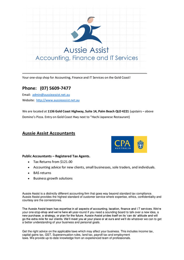 Palm Beach are focused solely on ensuring clients enjoy the excitement of buying a new home or investment property, by making the home loan application process easy and stress-free. We work closely with Aussie Assist Accountants to provide a one-stop shop for all your Finance and Accounting (as well as I.T!) needs. Aussie Assist Finance offers professional home loan advice for a wide range of requirements, such as: first home buyer finance; new home finance; property investment loans; home loan refinancing; fixed, variable and interest only home loan packages; personal loans commercial finance; car and larger motor vehicle loans We are you a One-Stop Shop for your Accountants and Income Tax services, Finance (housing loans, investment loans, refinance, car loans), and IT Services on the Gold Coast! Aussie Assist – I.T. Services. Is your computer running slow? We can help you! - Computer Repairs, tune up, new setups and upgrades - Virus Removal - computer clean-up - Need a new computer? Purchasing assistance and advice. - Backing up and restoration of files from old to new computer - Home networking, WiFi setup, printers, copiers, cell phones, iPads, tablets. - Personalized one-on-one training available. - We offer a 25% Seniors discount (must show seniors card) Drop-off repairs with same day service in most cases. Park at rear of building and text or call 0488 882227 and we will come down to assist you. Location: 1136 Gold Coast Highway, Suite 14 (Above Domino’s Pizza!), PALM BEACH Bring this pamphlet with you for a 10% discount for new customers! Southern Beaches Accounting Pty Ltd ACN: 164 552 550 Trading as Aussie Assist Accounting, Finance & IT Services.