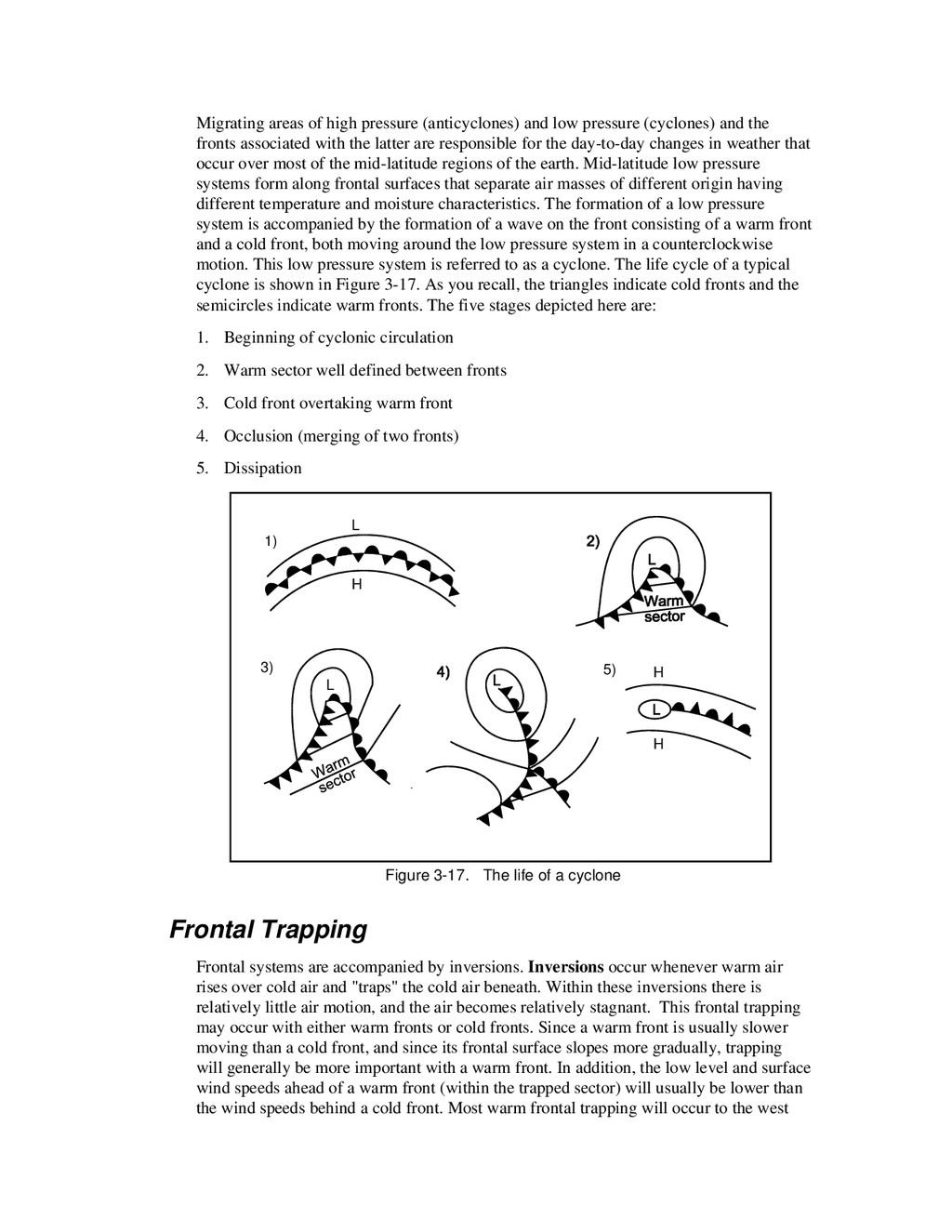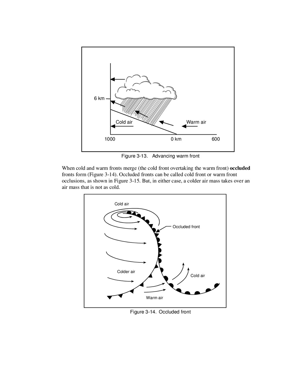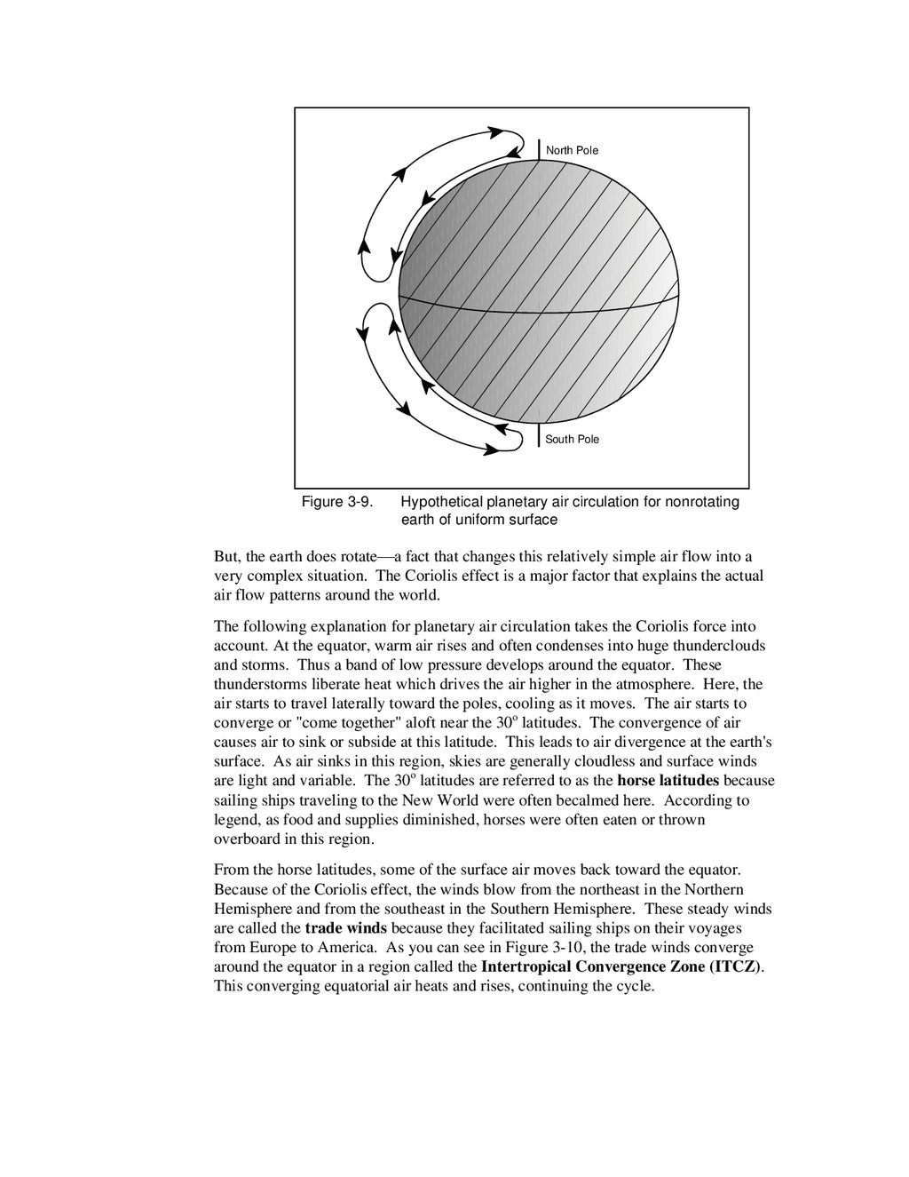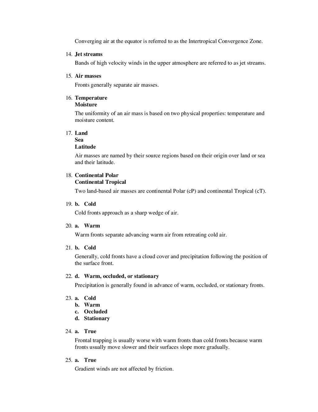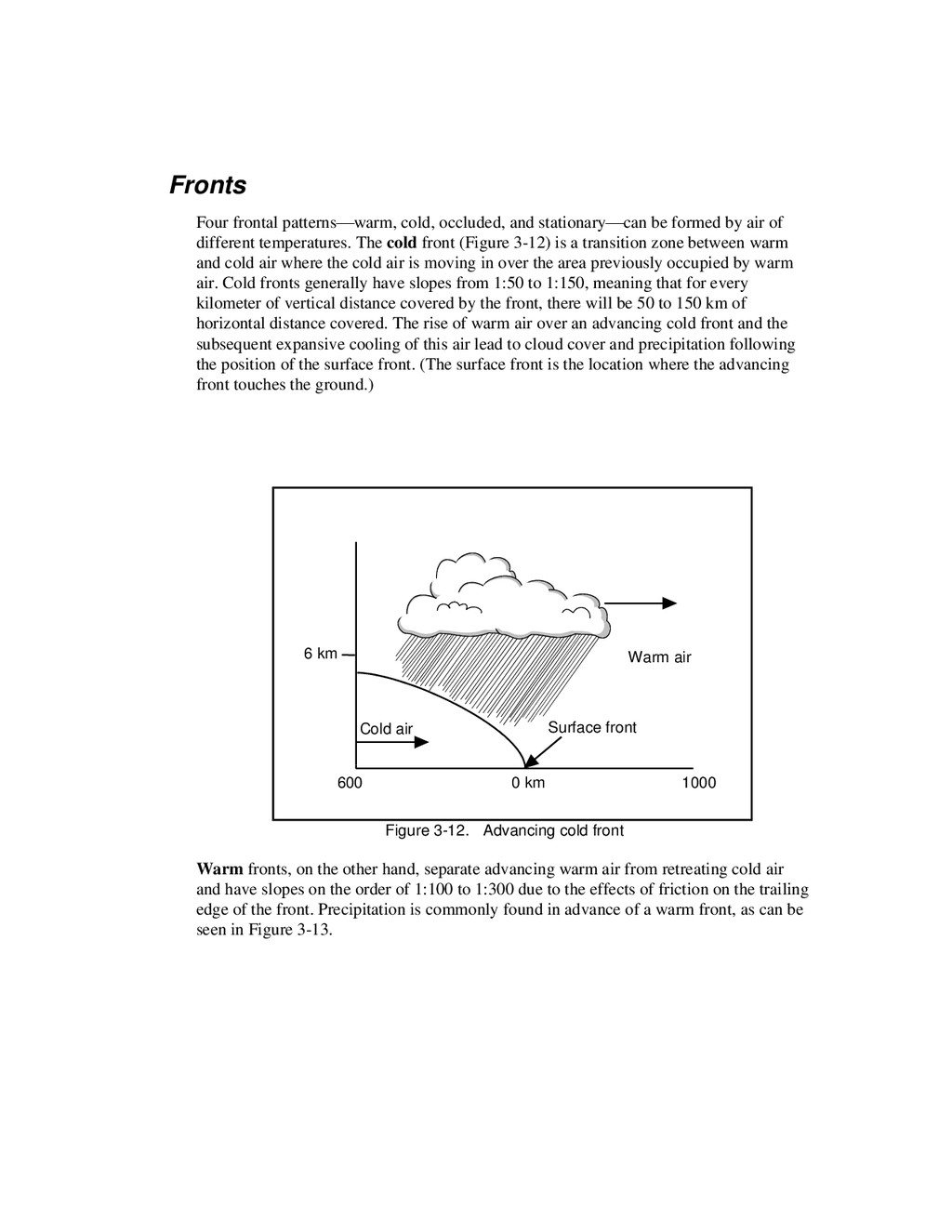 Arctic Polar regions Low temperatures, low specific but high summer relative humidity, the coldest of the winter air masses A Polar continental* Subpolar continental areas Low temperatures (increasing with southward movement), low humidity, remaining constant cP Polar maritime Subpolar area and arctic region Low temperatures, increasing with movement, higher humidity mP Tropical continental Subtropical high- pressure land areas High temperatures, low moisture content cT Tropical maritime Southern borders of oceanic subtropical, high- pressure areas Moderate high temperatures, high relative and specific humidity mT Note: The name of an air mass, such as Polar continental, can be reversed to continental Polar, but the symbol, cP, is the same for either name. Temperature is a basic property of air masses. The temperature of an air mass depends on the region where it originates. Arctic air masses are the coldest and tropical air masses are the warmest. Moisture is the second basic property in an air mass. Moisture plays such a significant role in weather and climate that it is commonly treated separately from the other constituents of air. In one or more of its forms, atmospheric moisture is a factor in humidity, cloudiness, precipitation, and visibility. Water vapor and clouds affect the transmission of radiation both to and from the earth's surface. Through the process of evaporation water vapor also conveys latent heat into the air, giving it a function in the heat exchange (as well as in the moisture exchange) between the earth and the atmosphere. Atmospheric water is gained by evaporation but lost by precipitation. Only a minute fraction of the earth's water is stored as clouds and vapor in the atmosphere at any one time. The net amount of water in the atmosphere at the end of any given period for a particular region is an algebraic summation of the amount stored from a previous period, the gain by evaporation, the gain or loss by horizontal transport, and the loss by precipitation. This relationship expresses the water balance of the atmosphere.