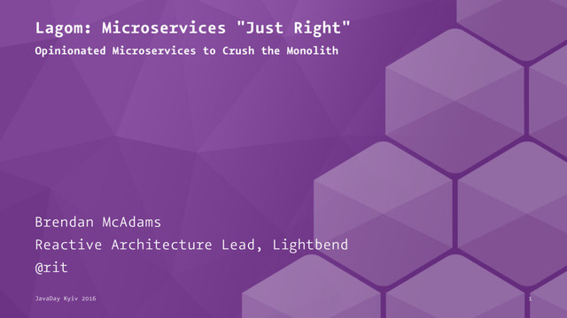 These opinions are there to simplify our development cycle... — Strong patterns guide our code into the right shape. — Lock into the right path, and build great systems. — The core tenets and opinions of Lagom are outlined in “Reactive Microservices Architecture” – a short, free ebook by Lightbend's co-Founder & CTO, Jonas Bonér. JavaDay Kyiv 2016 5