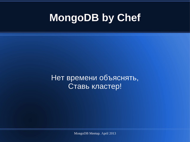 100 mongo cluster-ов. • Поиск решения • Chef — управляем серверами • Долго думаем и пишем рецепты • Поднимаем кластер за 30 минут • Добавляем 100 серверов