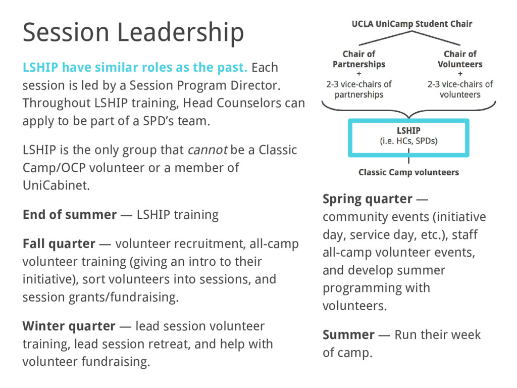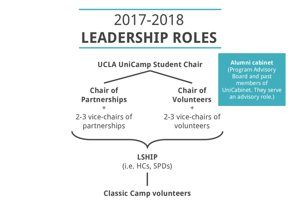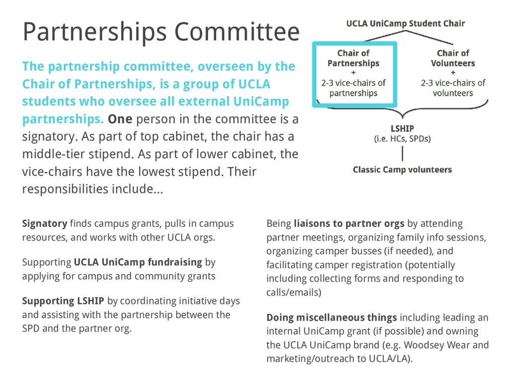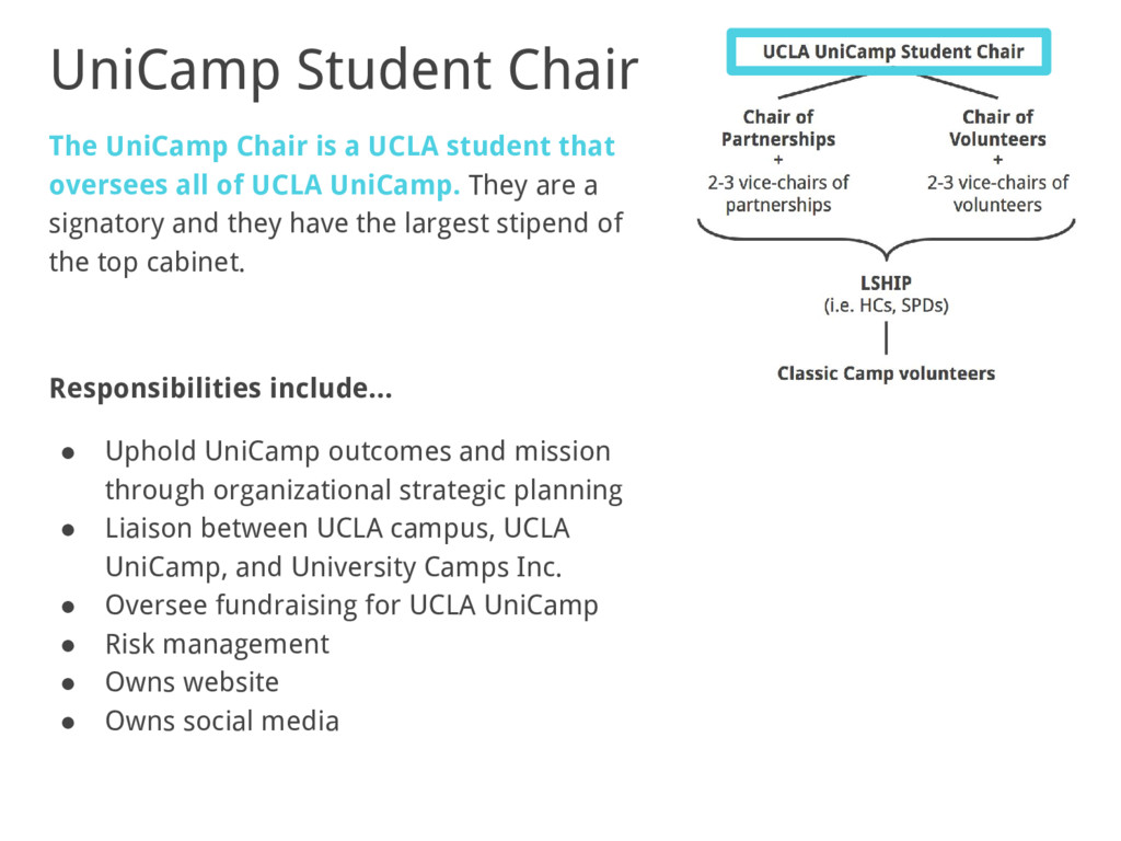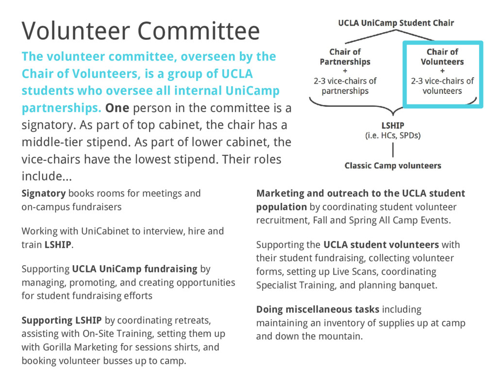 a group of UCLA students who oversee all internal UniCamp partnerships. One person in the committee is a signatory. As part of top cabinet, the chair has a middle-tier stipend. As part of lower cabinet, the vice-chairs have the lowest stipend. Their roles include... Volunteer Committee Signatory books rooms for meetings and on-campus fundraisers Working with UniCabinet to interview, hire and train LSHIP. Supporting UCLA UniCamp fundraising by managing, promoting, and creating opportunities for student fundraising efforts Supporting LSHIP by coordinating retreats, assisting with On-Site Training, setting them up with Gorilla Marketing for sessions shirts, and booking volunteer busses up to camp. Marketing and outreach to the UCLA student population by coordinating student volunteer recruitment, Fall and Spring All Camp Events. Supporting the UCLA student volunteers with their student fundraising, collecting volunteer forms, setting up Live Scans, coordinating Specialist Training, and planning banquet. Doing miscellaneous tasks including maintaining an inventory of supplies up at camp and down the mountain.