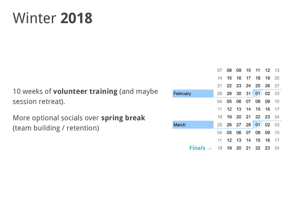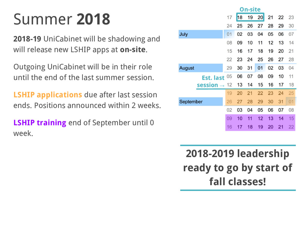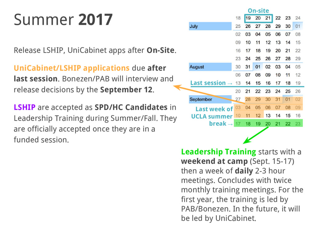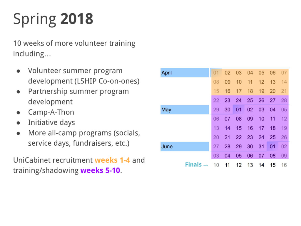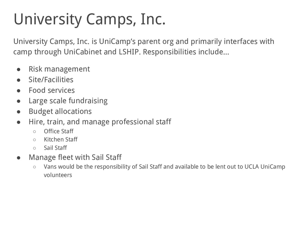 a group of UCLA students who oversee all internal UniCamp partnerships. One person in the committee is a signatory. As part of top cabinet, the chair has a middle-tier stipend. As part of lower cabinet, the vice-chairs have the lowest stipend. Their roles include... Volunteer Committee Signatory books rooms for meetings and on-campus fundraisers Working with UniCabinet to interview, hire and train LSHIP. Supporting UCLA UniCamp fundraising by managing, promoting, and creating opportunities for student fundraising efforts Supporting LSHIP by coordinating retreats, assisting with On-Site Training, setting them up with Gorilla Marketing for sessions shirts, and booking volunteer busses up to camp. Marketing and outreach to the UCLA student population by coordinating student volunteer recruitment, Fall and Spring All Camp Events. Supporting the UCLA student volunteers with their student fundraising, collecting volunteer forms, setting up Live Scans, coordinating Specialist Training, and planning banquet. Doing miscellaneous tasks including maintaining an inventory of supplies up at camp and down the mountain.