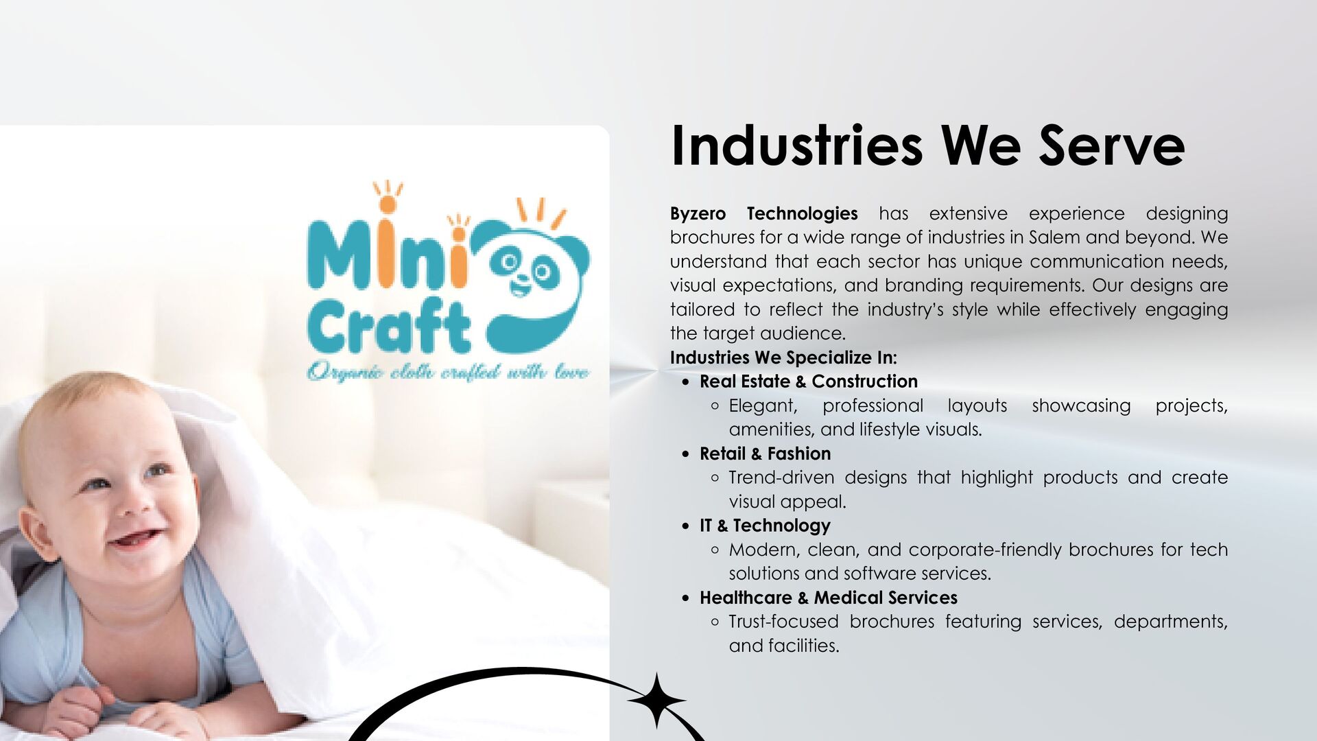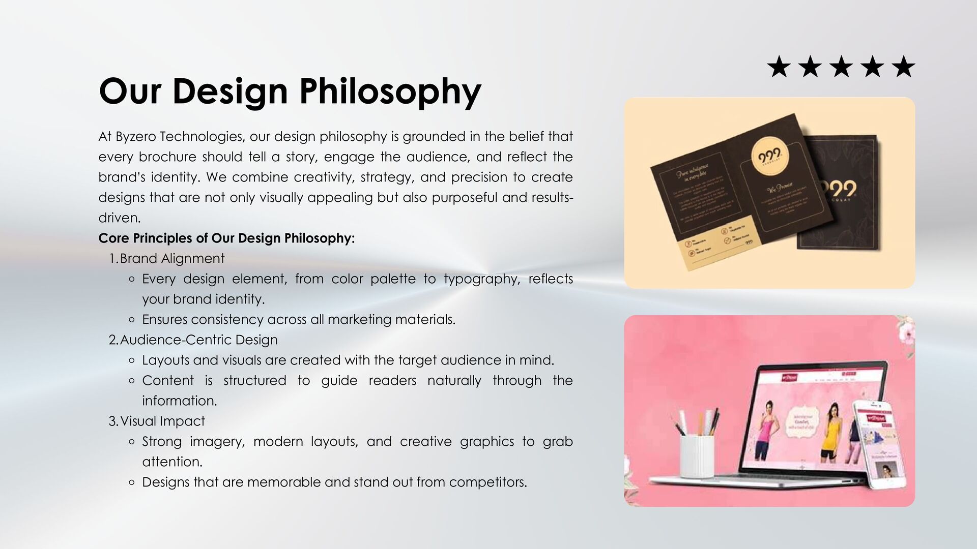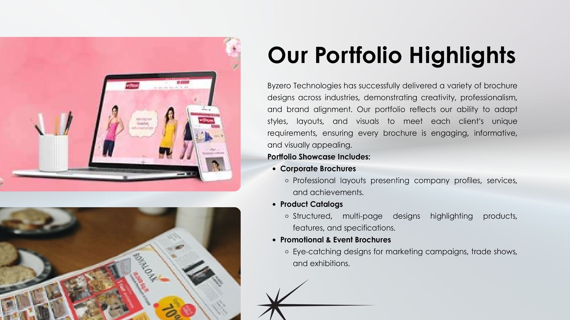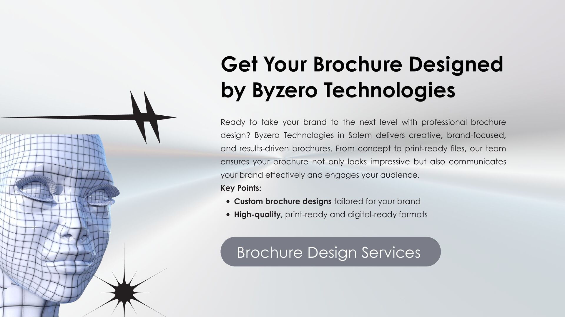 Byzero Technologies offers professional brochure design services in Salem, delivering creative, brand-focused, and results-driven brochures. From concept to print-ready files, our team ensures your brochure communicates your brand effectively, engages your audience, and enhances your business visibility.