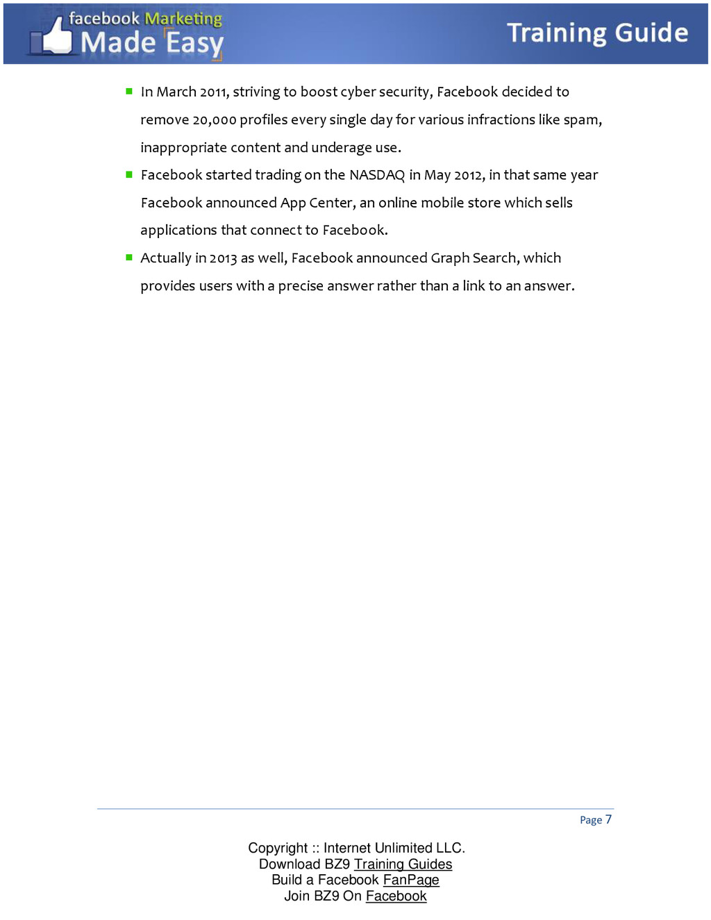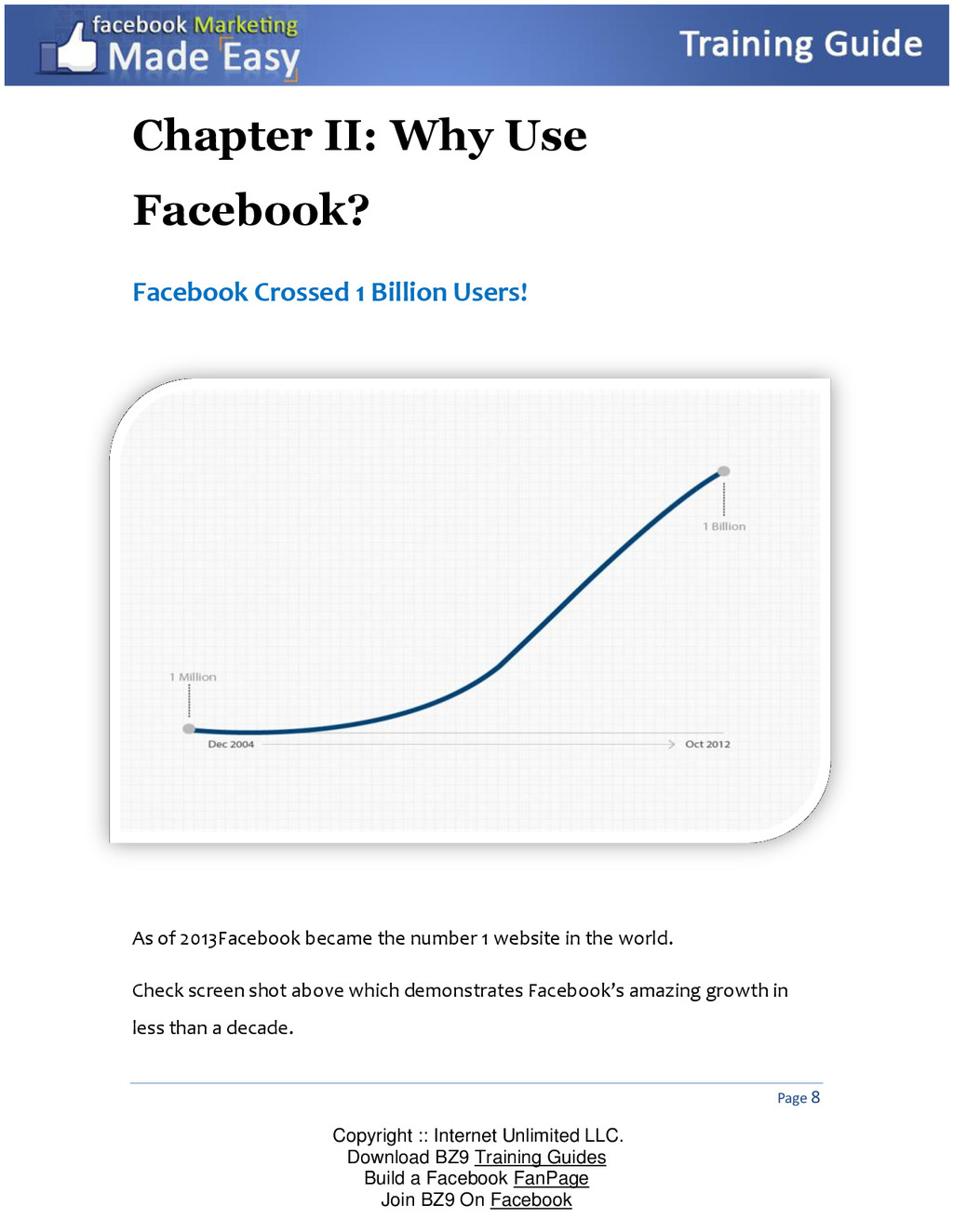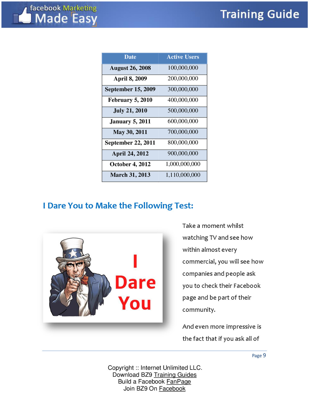 Guides Build a Facebook FanPage Join BZ9 On Facebook Date Active Users August 26, 2008 100,000,000 April 8, 2009 200,000,000 September 15, 2009 300,000,000 February 5, 2010 400,000,000 July 21, 2010 500,000,000 January 5, 2011 600,000,000 May 30, 2011 700,000,000 September 22, 2011 800,000,000 April 24, 2012 900,000,000 October 4, 2012 1,000,000,000 March 31, 2013 1,110,000,000 I Dare You to Make the Following Test: Take a moment whilst watching TV and see how within almost every commercial, you will see how companies and people ask you to check their Facebook page and be part of their community. And even more impressive is the fact that if you ask all of