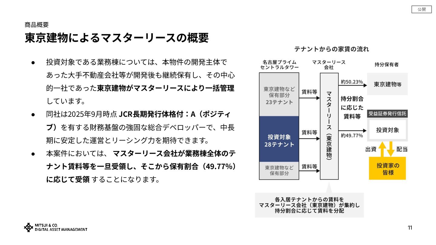 同社は2025年9⽉時点 JCR⻑期発⾏体格付:A(ポジティ ブ)を有する財務基盤の強固な総合デベロッパーで、中⻑ 期に安定した運営とリーシング⼒を期待できます。 • 本案件においては、 マスターリース会社が業務棟全体のテ ナント賃料等を⼀旦受領し、そこから保有割合(49.77%) に応じて受領 することになります。