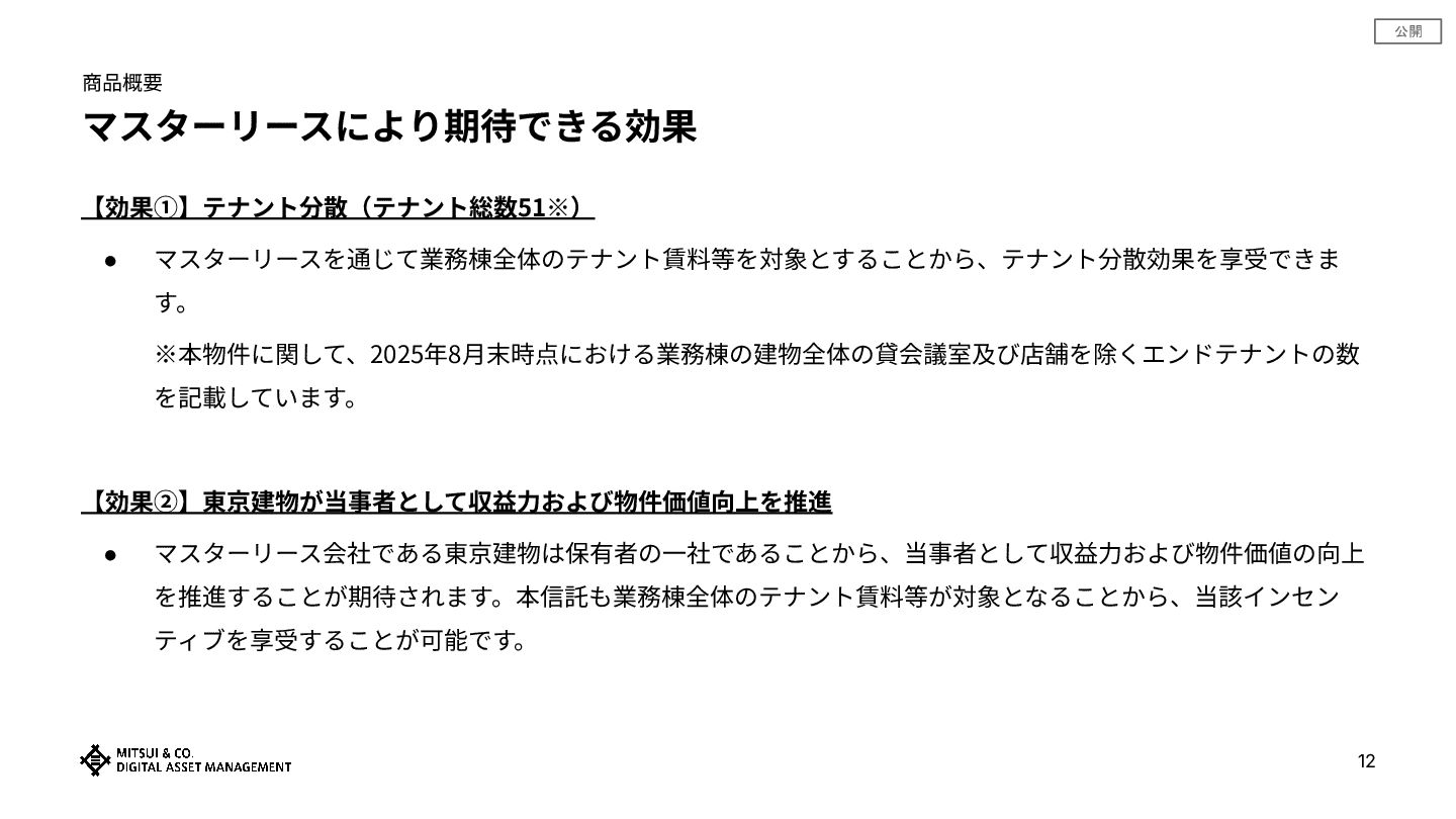 公開 商品概要 東京建物によるマスターリースの概要 11 • 投資対象である業務棟については、本物件の開発主体で あった⼤⼿不動産会社等が開発後も継続保有し、その中⼼ 的⼀社であった東京建物がマスターリースにより⼀括管理 しています。 •