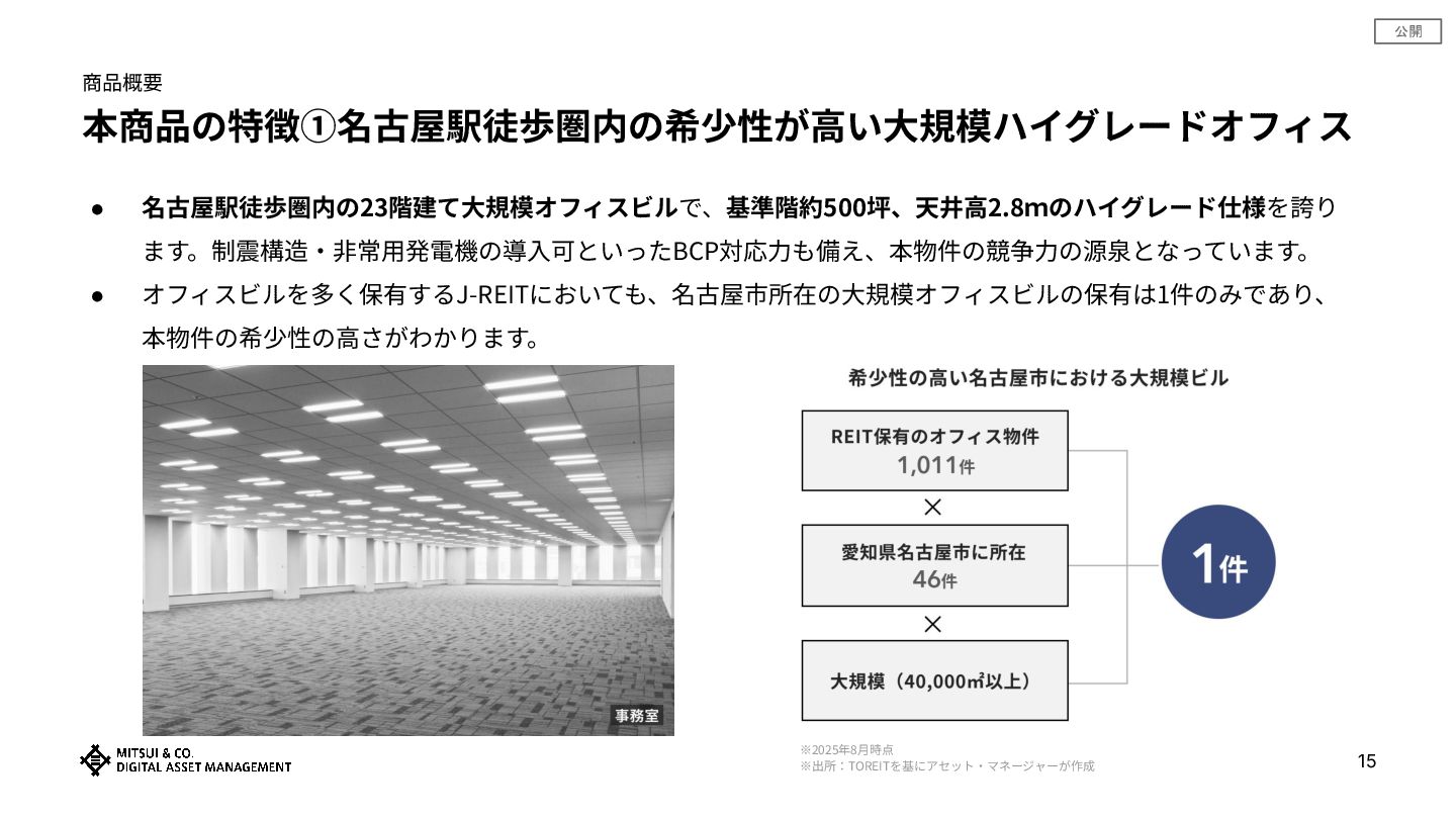 公開 商品概要 本商品の特徴①名古屋駅徒歩圏内の希少性が⾼い⼤規模ハイグレードオフィス 15 • 名古屋駅徒歩圏内の23階建て⼤規模オフィスビルで、基準階約500坪、天井⾼2.8mのハイグレード仕様を誇り ます。制震構造‧⾮常⽤発電機の導⼊可といったBCP対応⼒も備え、本物件の競争⼒の源泉となっています。 • オフィスビルを多く保有するJ-REITにおいても、名古屋市所在の⼤規模オフィスビルの保有は1件のみであり、 本物件の希少性の⾼さがわかります。