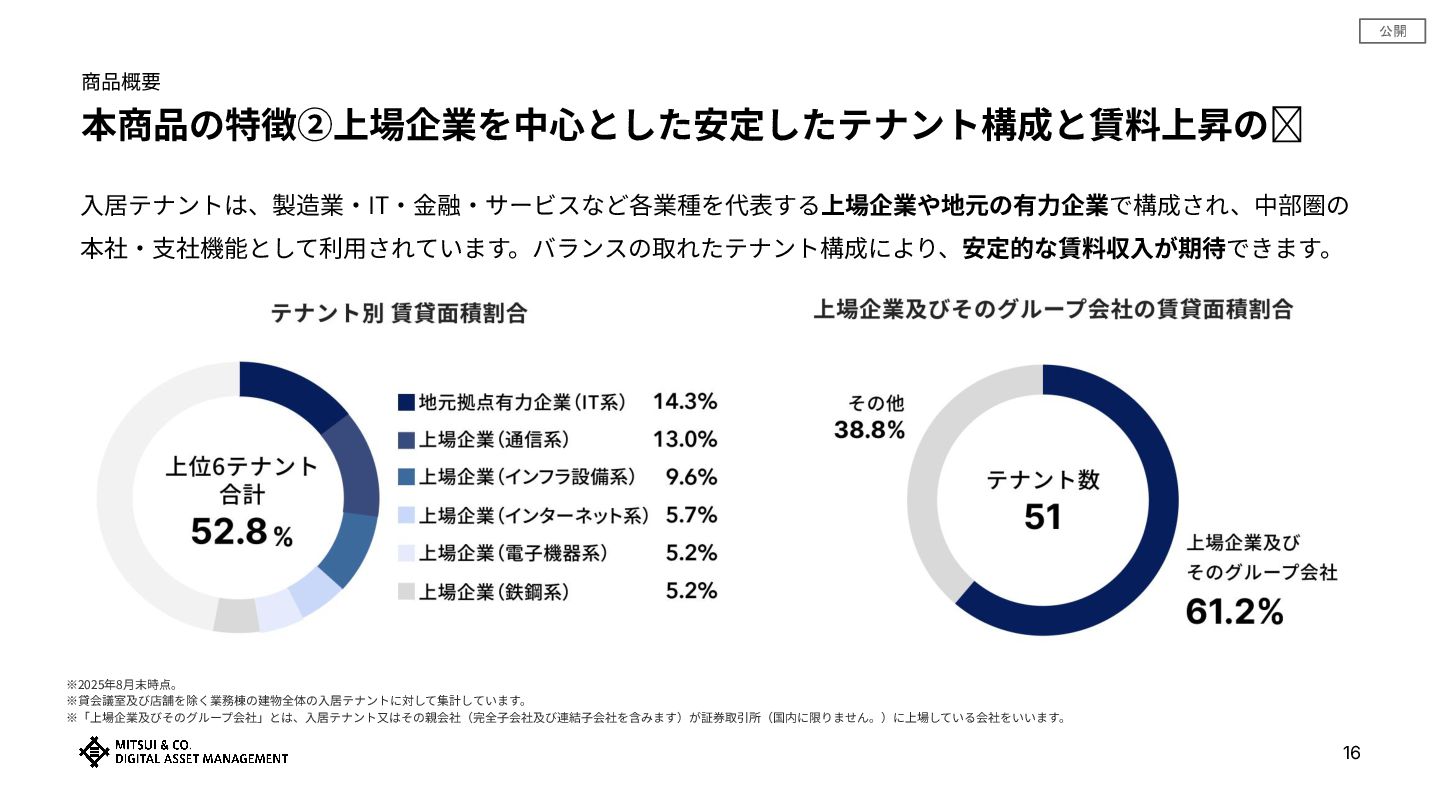 公開 商品概要 本商品の特徴②上場企業を中⼼とした安定したテナント構成と賃料上昇の余地 16 ⼊居テナントは、製造業‧IT‧⾦融‧サービスなど各業種を代表する上場企業や地元の有⼒企業で構成され、中部圏の 本社‧⽀社機能として利⽤されています。バランスの取れたテナント構成により、安定的な賃料収⼊が期待できます。 ※2025年8⽉末時点。 ※貸会議室及び店舗を除く業務棟の建物全体の⼊居テナントに対して集計しています。 ※「上場企業及びそのグループ会社」とは、⼊居テナント⼜はその親会社(完全⼦会社及び連結⼦会社を含みます)が証券取引所(国内に限りません。)に上場している会社をいいます。