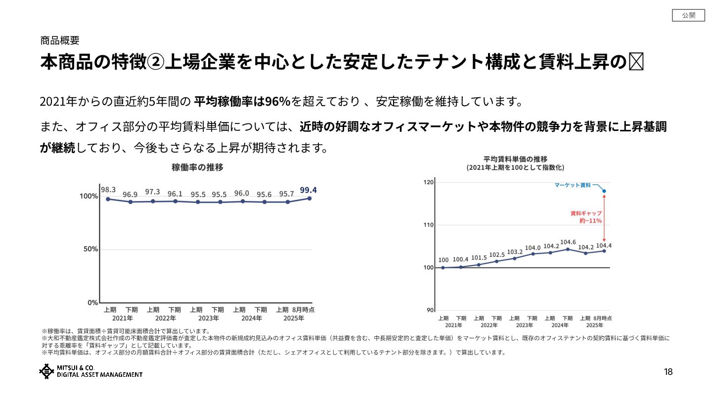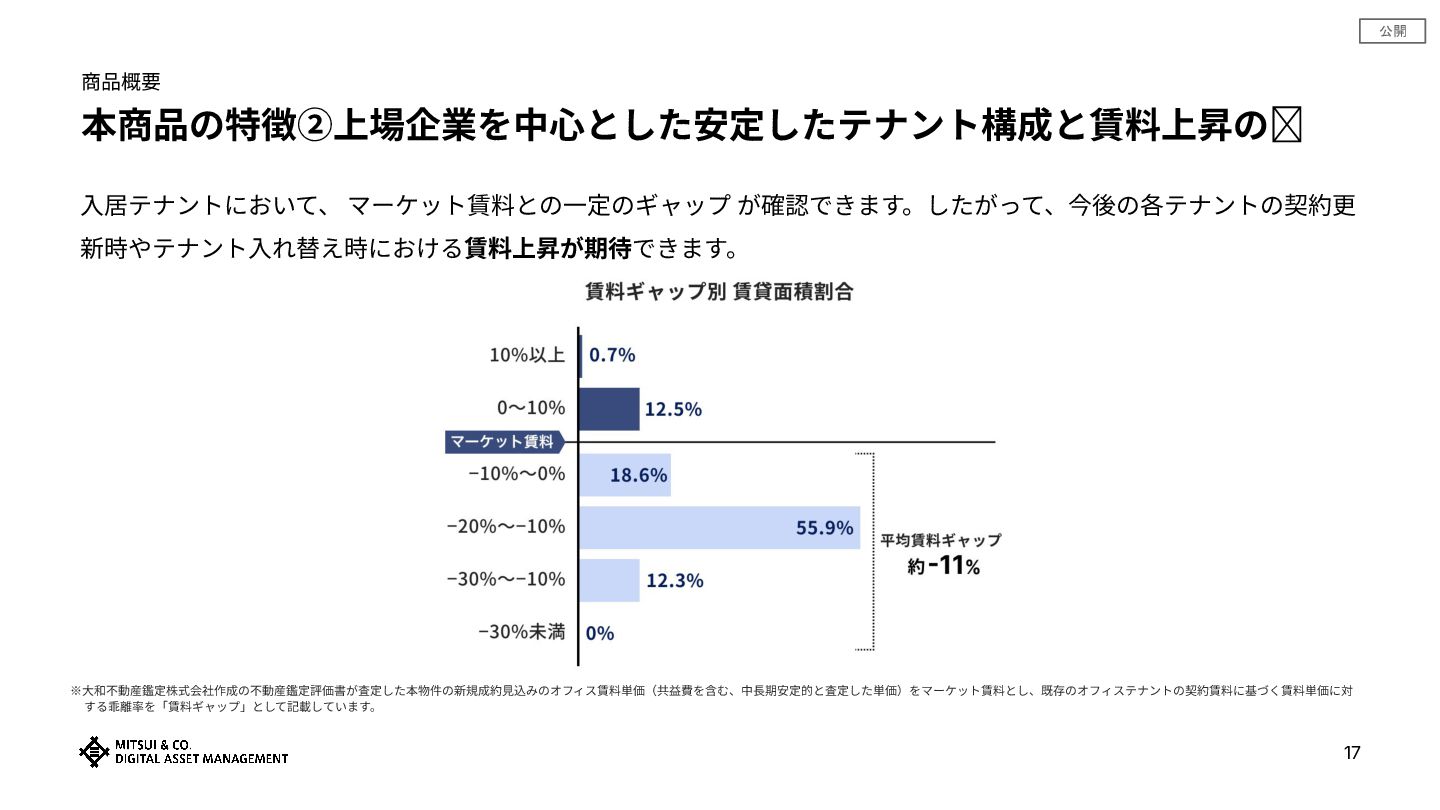 公開 商品概要 本商品の特徴②上場企業を中⼼とした安定したテナント構成と賃料上昇の余地 17 ⼊居テナントにおいて、 マーケット賃料との⼀定のギャップ が確認できます。したがって、今後の各テナントの契約更 新時やテナント⼊れ替え時における賃料上昇が期待できます。 ※⼤和不動産鑑定株式会社作成の不動産鑑定評価書が査定した本物件の新規成約⾒込みのオフィス賃料単価(共益費を含む、中⻑期安定的と査定した単価)をマーケット賃料とし、既存のオフィステナントの契約賃料に基づく賃料単価に対 する乖離率を「賃料ギャップ」として記載しています。
