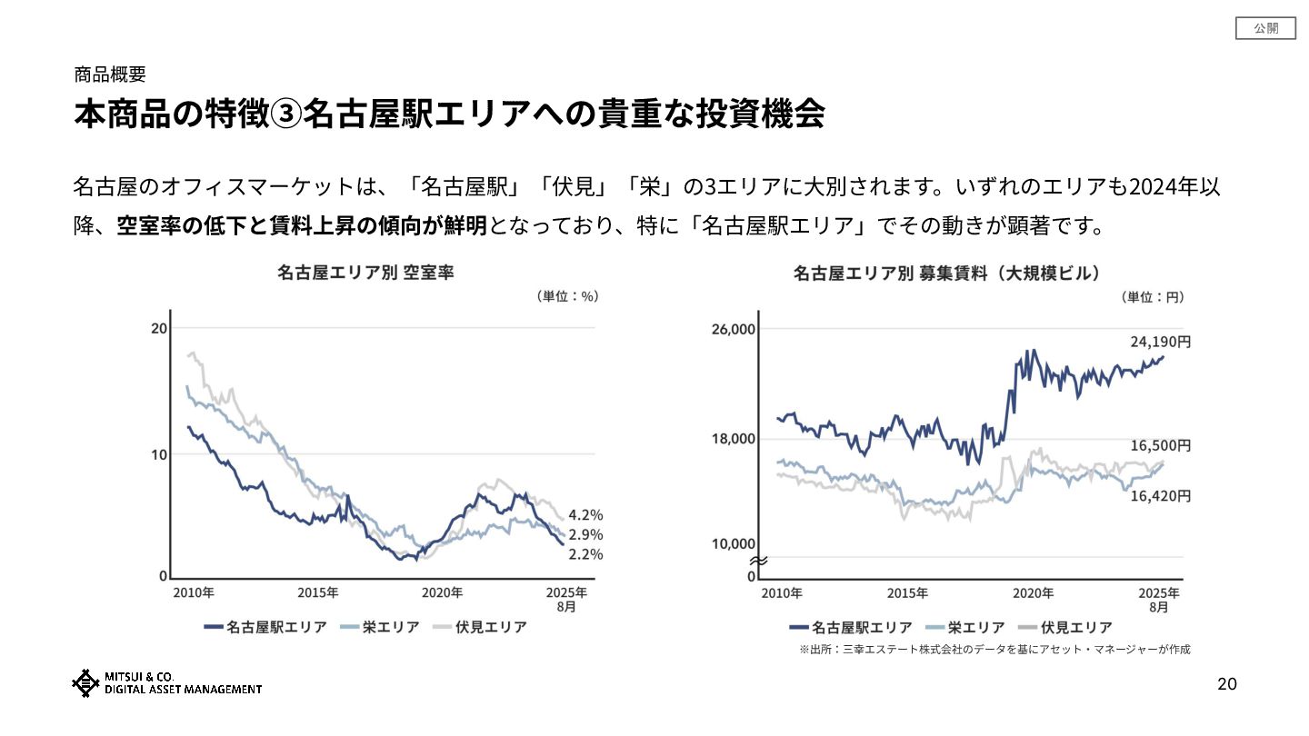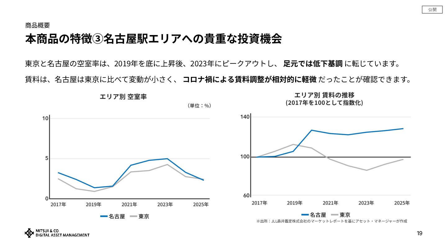 公開 商品概要 本商品の特徴③名古屋駅エリアへの貴重な投資機会 19 東京と名古屋の空室率は、2019年を底に上昇後、2023年にピークアウトし、 ⾜元では低下基調 に転じています。 賃料は、名古屋は東京に⽐べて変動が⼩さく、 コロナ禍による賃料調整が相対的に軽微 だったことが確認できます。