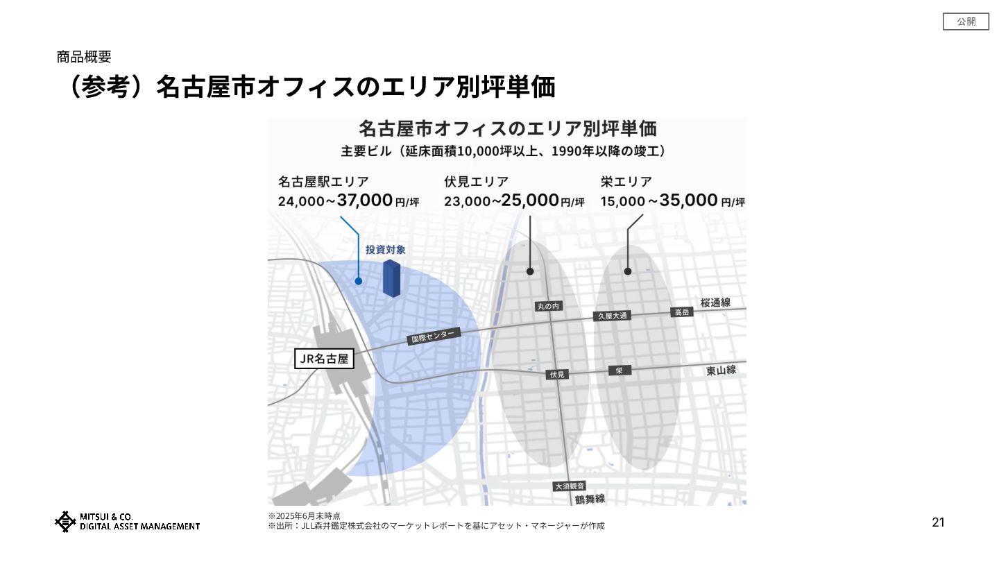 公開 商品概要 (参考)名古屋市オフィスのエリア別坪単価 21 ※2025年6⽉末時点 ※出所:JLL森井鑑定株式会社のマーケットレポートを基にアセット‧マネージャーが作成