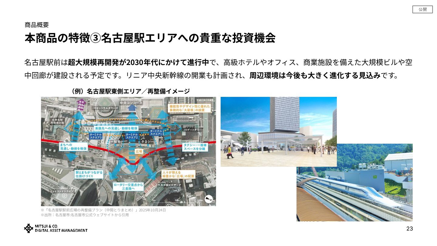 公開 商品概要 本商品の特徴③名古屋駅エリアへの貴重な投資機会 23 名古屋駅前は超⼤規模再開発が2030年代にかけて進⾏中で、⾼級ホテルやオフィス、商業施設を備えた⼤規模ビルや空 中回廊が建設される予定です。リニア中央新幹線の開業も計画され、周辺環境は今後も⼤きく進化する⾒込みです。 (例)名古屋駅東側エリア∕再整備イメージ ※「名古屋駅駅前広場の再整備プラン(中間とりまとめ)」2025年10⽉24⽇ ※出所:名古屋市:名古屋市公式ウェブサイトから引⽤