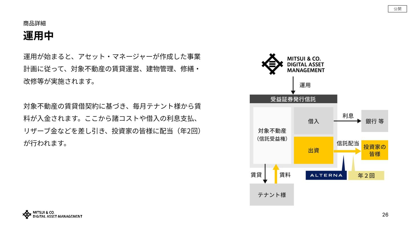 • 提供情報‧内容の数値等は、過去の実績値、概算値または計算値であり、実際とは異なる場合があります。また、予告なしに内容が 変更⼜は廃⽌される場合があります。 • 提供情報は、当社が著作権を有しますので、提供されましたお客さま限りでご使⽤ください。当社の事前承諾なしにこれを複製し、 改変し、刊⾏し、配布し、転⽤し、若しくは掲載すること及びこれを商業的に利⽤することを禁⽌します。また、本資料に掲載されている当社に関連 する商標類(商標、ロゴ及びサービスマーク)は、当社に属するものであり、 これを当社に無断で複製し、改変し、刊⾏し、配布し、転⽤し、若し くは転載すること及びこれを商業的に利⽤することを禁⽌します。 • 提供情報‧内容の投資対象物件等については、例⽰として掲載しているものですので、将来の取得‧成果等を⽰唆ないし保証するものではありませ ん。 • 本資料は、お客さまに対して税⾦、会計⼜は法律上のアドバイスを提供するものではありません。また、⽇本の居住者が利⽤するために作成されたも のであり、その他の国の居住者を対象とするものではありません。 • 投資に関する最終決定は、お客様向け資料等をよくお読みになり、お客様ご⾃⾝の判断でなさるようお願いします。 • 「安定資産」とは、不動産やインフラなど、ALTERNA(オルタナ)が提供を予定する⾦融商品の投資対象資産を指し、当資産の持続的な稼働によ り、中⻑期での安定的な投資成果の獲得を期待するものです。なおALTERNA(オルタナ)が提供する⾦融商品は元本保証や将来の投資成果を保証す るものではありません。 • 本商品は、三井物産株式会社の⼦会社である三井物産デジタル‧アセットマネジメント株式会社によって組成‧販売されるものです。
