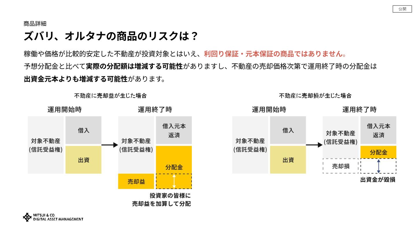 公開 商品詳細 ズバリ、オルタナの商品のリスクは? 稼働や価格が⽐較的安定した不動産が投資対象とはいえ、利回り保証‧元本保証の商品ではありません。 予想分配⾦と⽐べて実際の分配額は増減する可能性がありますし、不動産の売却価格次第で運⽤終了時の分配⾦は 出資⾦元本よりも増減する可能性があります。 不動産に売却益が生じた場合 不動産に売却損が生じた場合