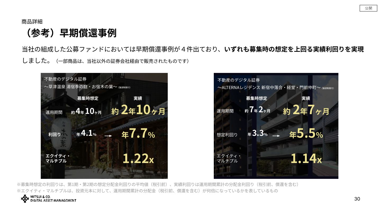 公開 商品詳細 (参考)早期償還事例 当社の組成した公募ファンドにおいては早期償還事例が4件出ており、いずれも募集時の想定を上回る実績利回りを実現 しました。(⼀部商品は、当社以外の証券会社経由で販売されたものです) 不動産のデジタル証券 〜草津温泉 湯宿季の庭‧お宿⽊の葉〜(譲渡制限付) 不動産のデジタル証券 〜ALTERNAレジデンス