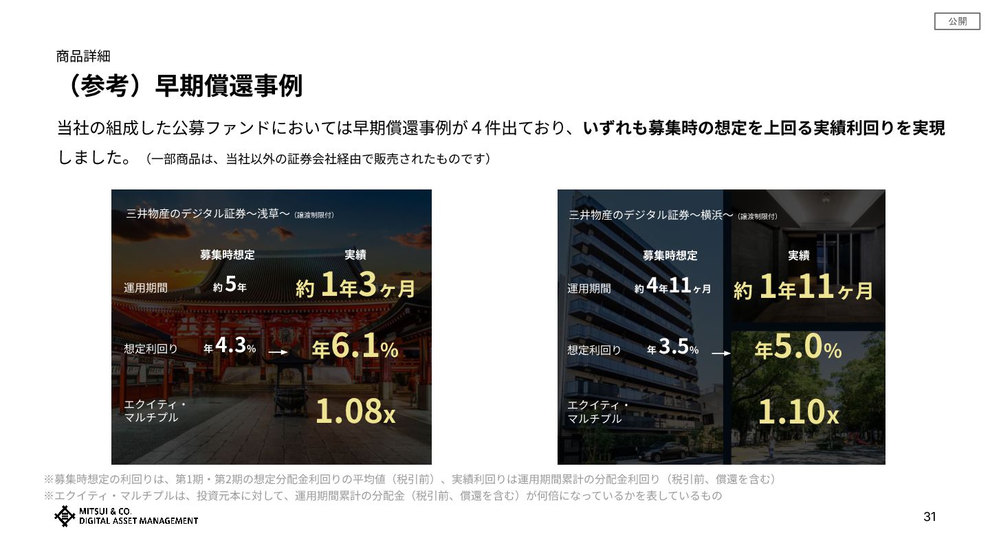 公開 商品詳細 (参考)早期償還事例 当社の組成した公募ファンドにおいては早期償還事例が4件出ており、いずれも募集時の想定を上回る実績利回りを実現 しました。(⼀部商品は、当社以外の証券会社経由で販売されたものです) ※募集時想定の利回りは、第1期‧第2期の想定分配⾦利回りの平均値(税引前)、実績利回りは運⽤期間累計の分配⾦利回り(税引前、償還を含む) ※エクイティ‧マルチプルは、投資元本に対して、運⽤期間累計の分配⾦(税引前、償還を含む)が何倍になっているかを表しているもの 31 三井物産のデジタル証券〜浅草〜(譲渡制限付) 運⽤期間