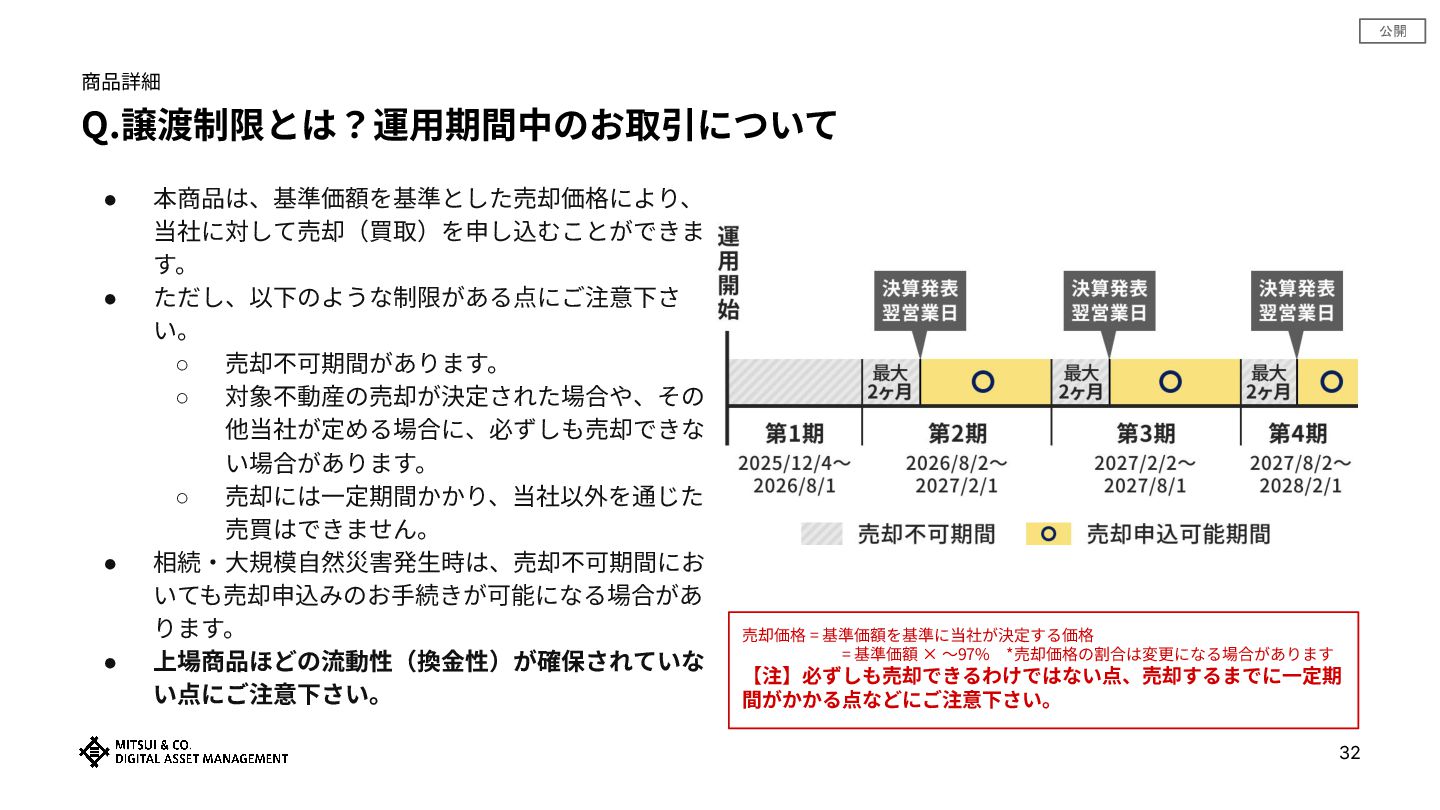 【注】必ずしも売却できるわけではない点、売却するまでに⼀定期 間がかかる点などにご注意下さい。 • 本商品は、基準価額を基準とした売却価格により、 当社に対して売却(買取)を申し込むことができま す。 • ただし、以下のような制限がある点にご注意下さ い。 ◦ 売却不可期間があります。 ◦ 対象不動産の売却が決定された場合や、その 他当社が定める場合に、必ずしも売却できな い場合があります。 ◦ 売却には⼀定期間かかり、当社以外を通じた 売買はできません。 • 相続‧⼤規模⾃然災害発⽣時は、売却不可期間にお いても売却申込みのお⼿続きが可能になる場合があ ります。 • 上場商品ほどの流動性(換⾦性)が確保されていな い点にご注意下さい。 32 商品詳細