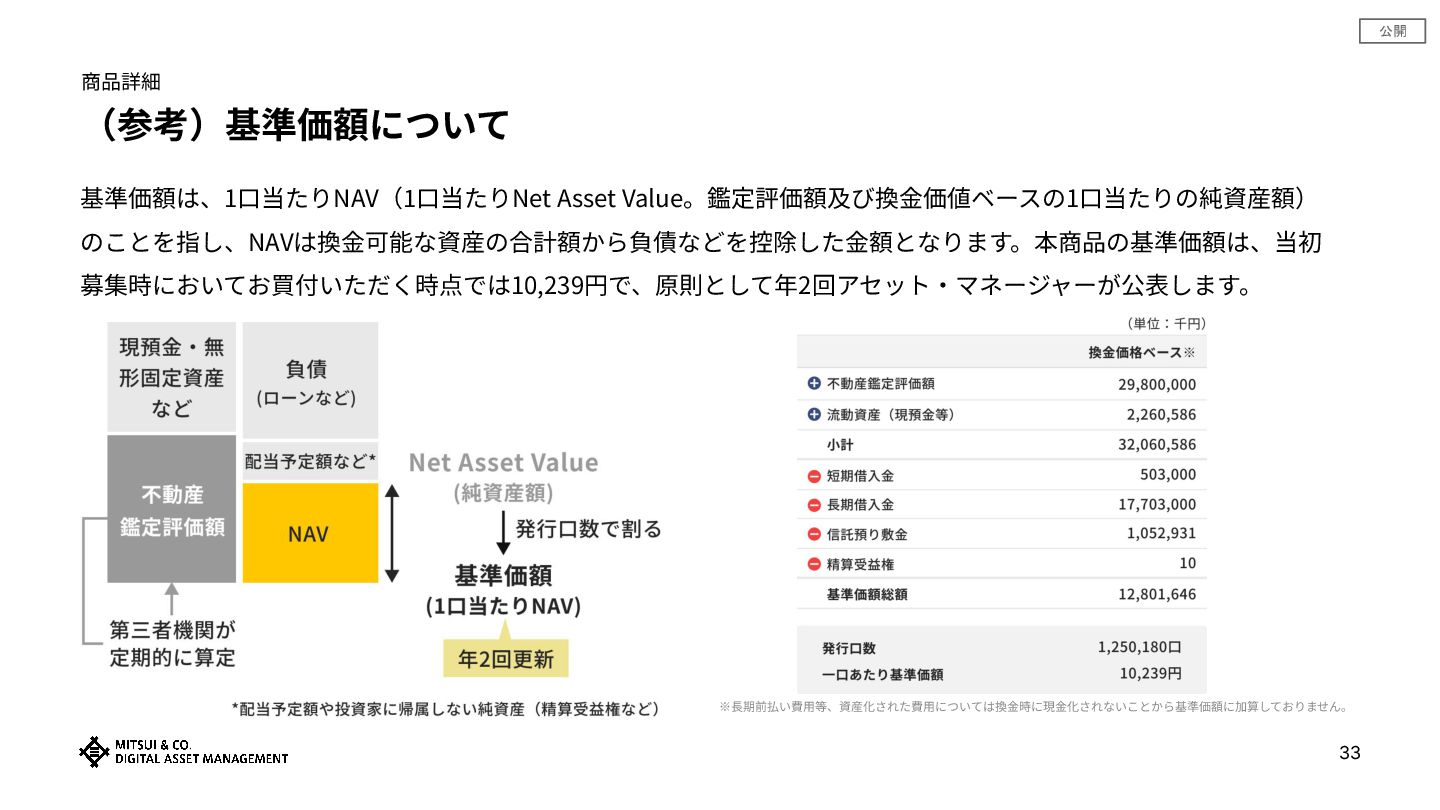公開 33 (参考)基準価額について 商品詳細 基準価額は、1⼝当たりNAV(1⼝当たりNet Asset Value。鑑定評価額及び換⾦価値ベースの1⼝当たりの純資産額) のことを指し、NAVは換⾦可能な資産の合計額から負債などを控除した⾦額となります。本商品の基準価額は、当初 募集時においてお買付いただく時点では10,239円で、原則として年2回アセット‧マネージャーが公表します。 ※⻑期前払い費⽤等、資産化された費⽤については換⾦時に現⾦化されないことから基準価額に加算しておりません。