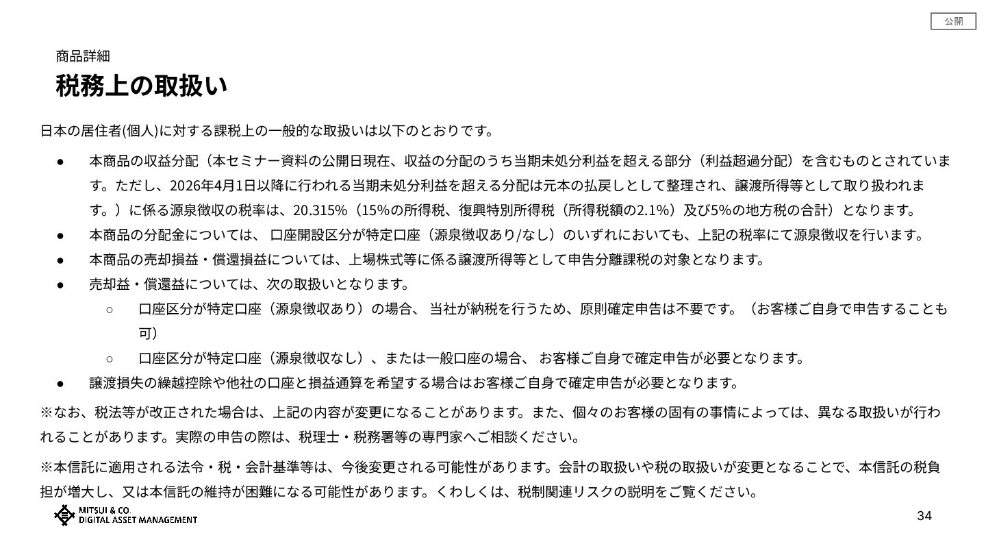 公開 • 本信託に適⽤される法令‧税‧会計基準等は、今後変更される可能性があります。会計の取扱いや税の取扱いが 変更となることで、本信託の税負担が増⼤し、⼜は本信託の維持が困難になる可能性があります。 • 本セミナー資料の公開⽇現在、収益の分配には当期未処分利益を超える部分(利益超過分配)を含むものとされ ていますが、2026年4⽉1⽇以降に⾏われる当期未処分利益を超える分配は特定受益証券発⾏信託の元本の払戻 しとして整理され、譲渡所得等として取り扱われることにより、本受益権を保有する投資家への課税⽅法及び課 税額が変更されます。なお、当該取り扱いの変更に伴い、取扱⾦融商品取引業者において当該改正に対応したシ ステムの修正等が必要になる可能性があり、対応が適時に⾏われない場合、本受益権を保有する投資家に事務⼿