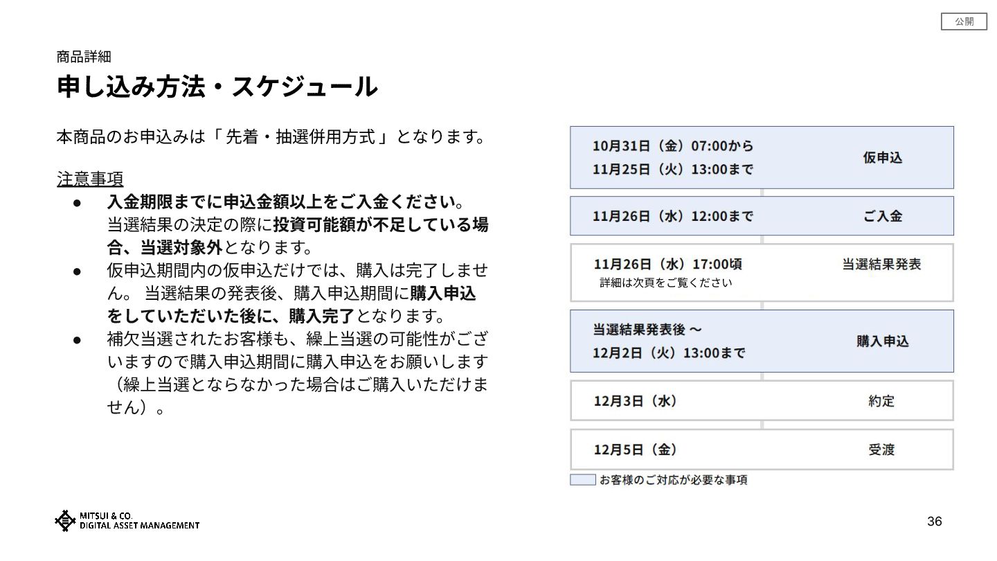 公開 申し込み⽅法‧スケジュール 注意事項 • ⼊⾦期限までに申込⾦額以上をご⼊⾦ください。 当選結果の決定の際に投資可能額が不⾜している場 合、当選対象外となります。 • 仮申込期間内の仮申込だけでは、購⼊は完了しませ ん。