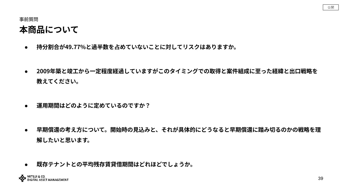 公開 事前質問 本商品について • 持分割合が49.77%と過半数を占めていないことに対してリスクはありますか。 • 2009年築と竣⼯から⼀定程度経過していますがこのタイミングでの取得と案件組成に⾄った経緯と出⼝戦略を 教えてください。 • 運⽤期間はどのように定めているのですか?