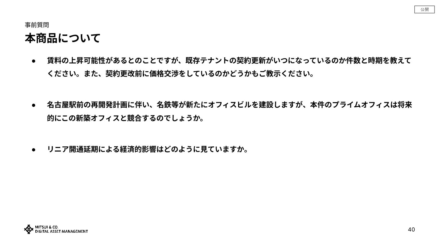 公開 事前質問 本商品について • 賃料の上昇可能性があるとのことですが、既存テナントの契約更新がいつになっているのか件数と時期を教えて ください。また、契約更改前に価格交渉をしているのかどうかもご教⽰ください。 • 名古屋駅前の再開発計画に伴い、名鉄等が新たにオフィスビルを建設しますが、本件のプライムオフィスは将来 的にこの新築オフィスと競合するのでしょうか。 •