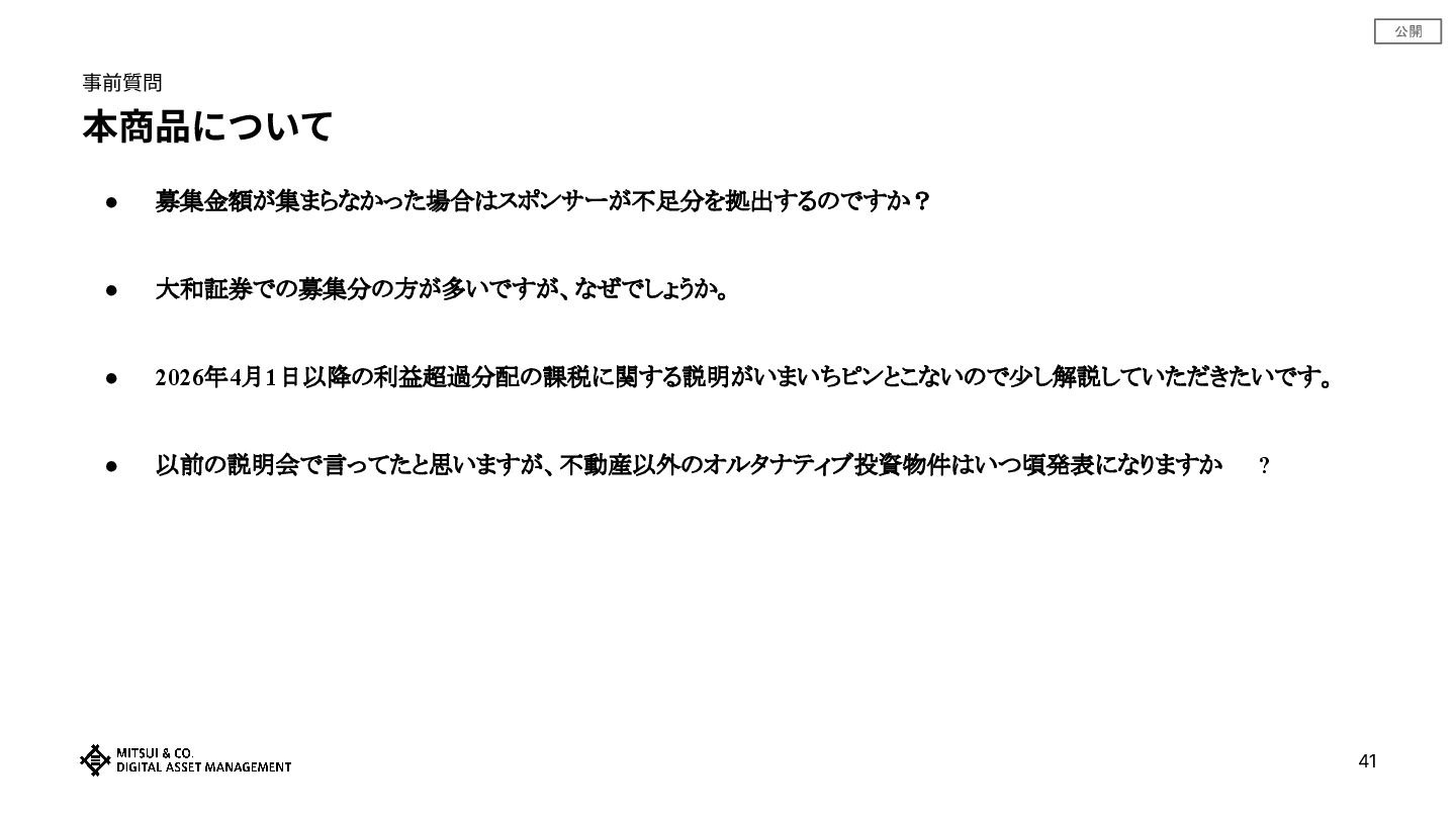 公開 事前質問 本商品について • 募集金額が集まらなかった場合はスポンサーが不足分を拠出するのですか? • 大和証券での募集分の方が多いですが、なぜでしょうか。 • 2026年4月1日以降の利益超過分配の課税に関する説明がいまいちピンとこないので少し解説していただきたいです。 •