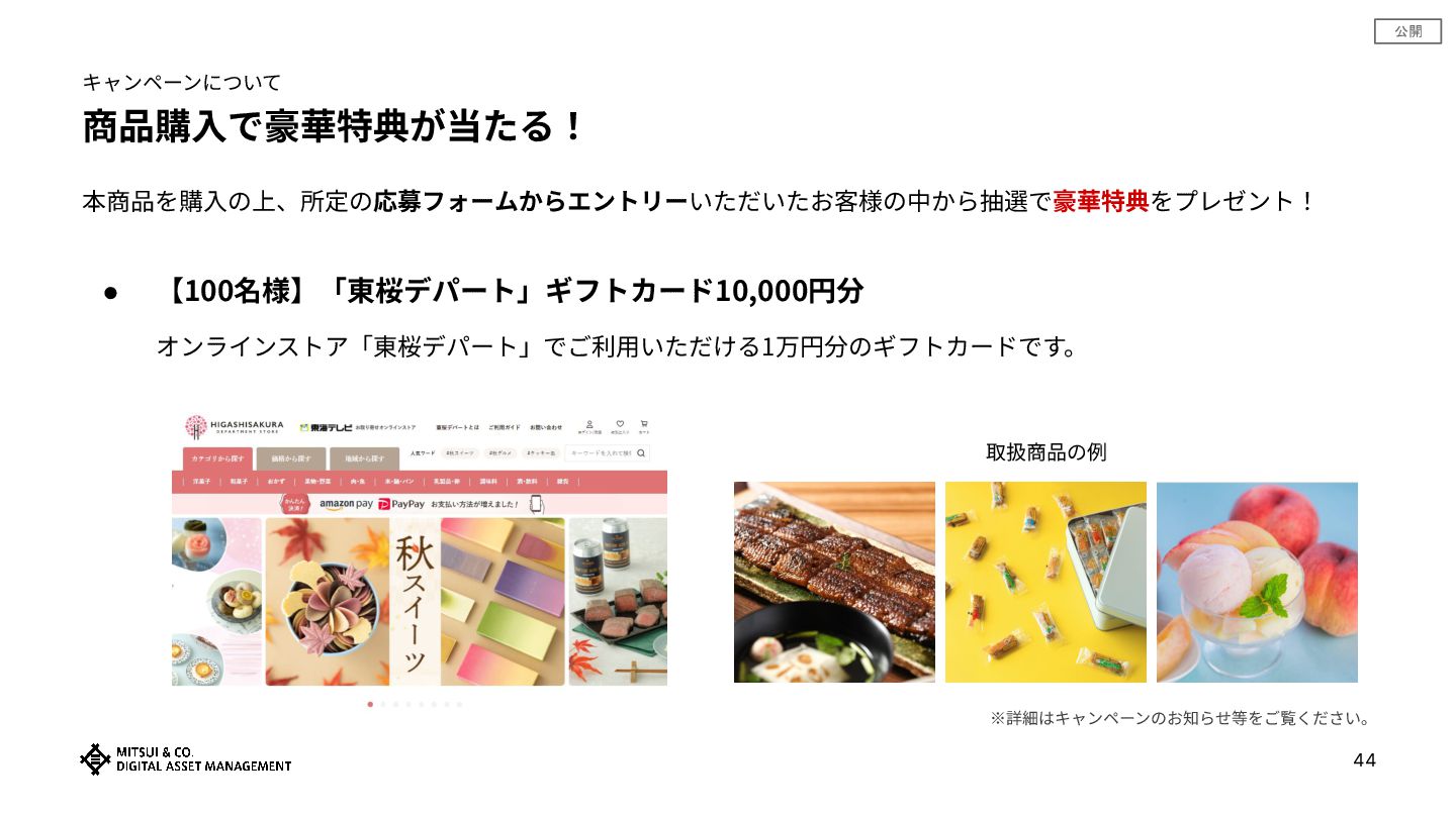 45 ※詳細はキャンペーンのお知らせ等をご覧ください。 ※本商品は、三井物産株式会社の⼦会社である三井物産デジタル‧アセットマネジメント株式会社によって組成‧販売されるものです。 キャンペーンについて