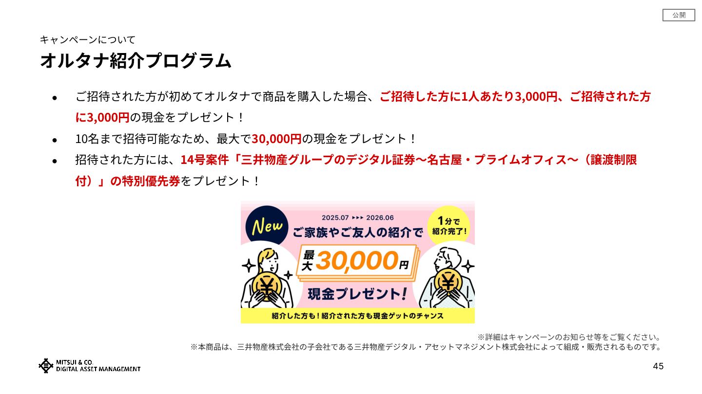公開 オルタナ紹介プログラム • ご招待された⽅が初めてオルタナで商品を購⼊した場合、ご招待した⽅に1⼈あたり3,000円、ご招待された⽅ に3,000円の現⾦をプレゼント! • 10名まで招待可能なため、最⼤で30,000円の現⾦をプレゼント! • 招待された⽅には、14号案件「三井物産グループのデジタル証券〜名古屋‧プライムオフィス〜(譲渡制限 付)」の特別優先券をプレゼント!