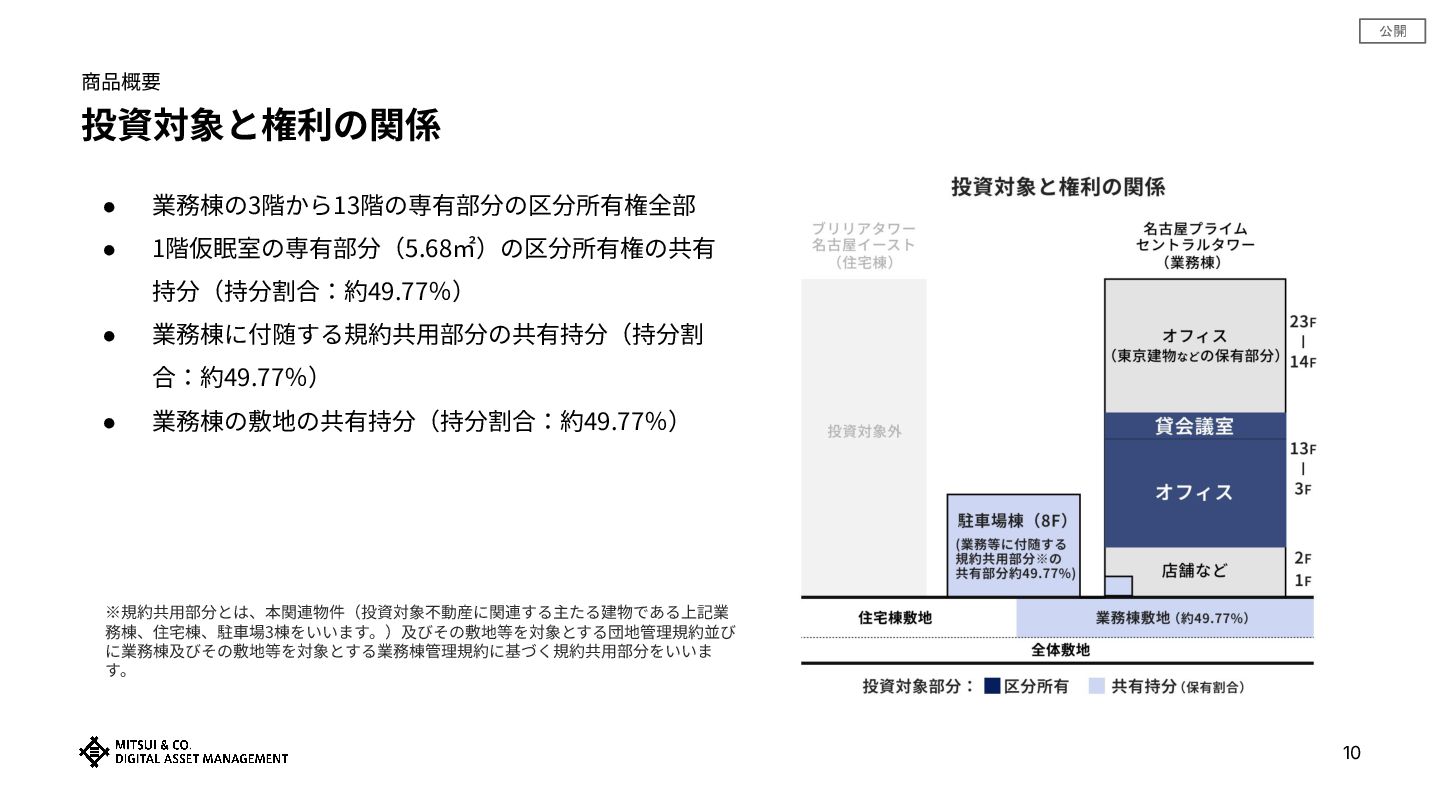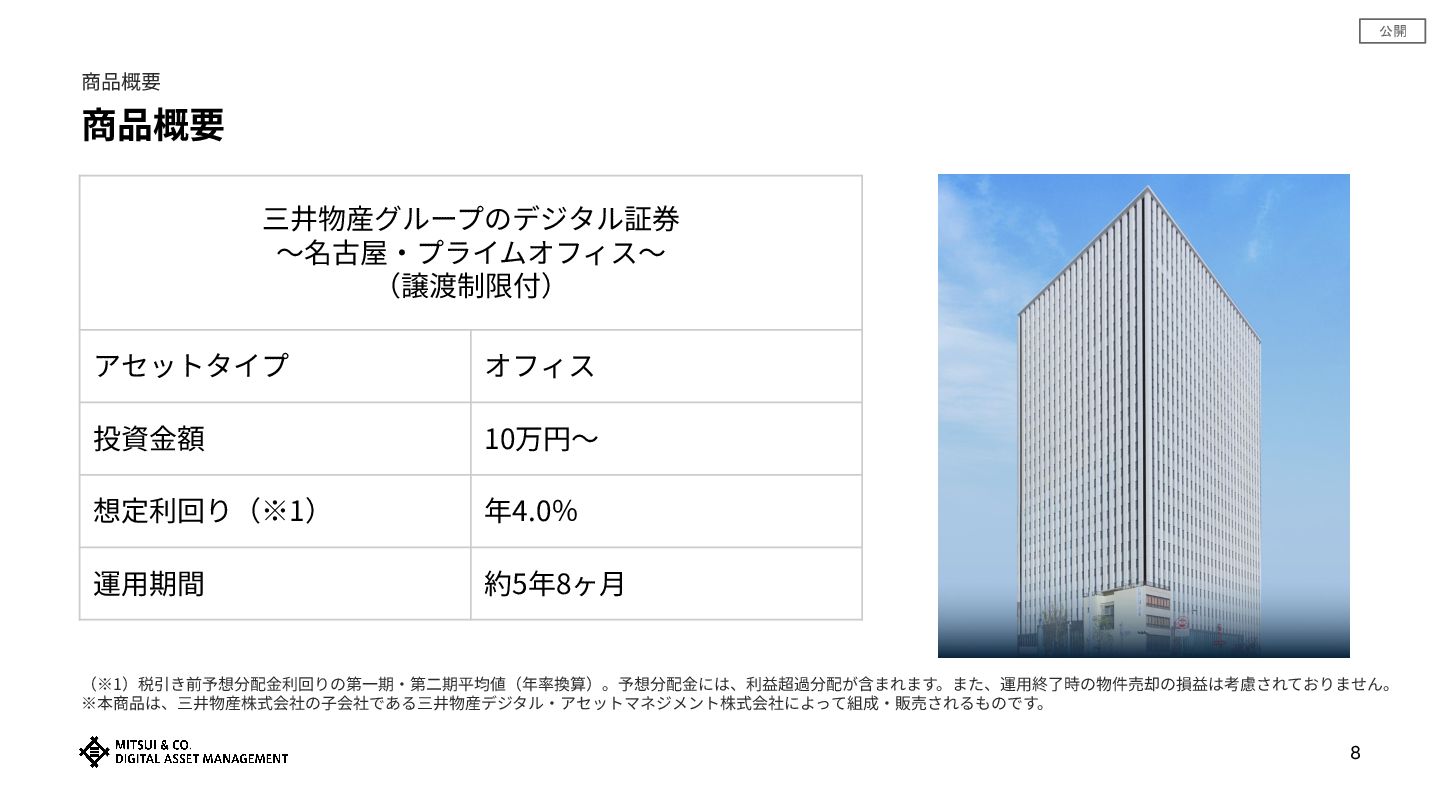 公開 8 商品概要 商品概要 三井物産グループのデジタル証券 〜名古屋‧プライムオフィス〜 (譲渡制限付) アセットタイプ オフィス 投資⾦額