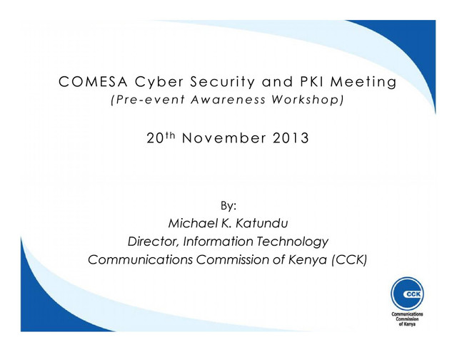 PKI Meeting ( Pre ( Pre - -e v e nt A ware ne ss Workshop) e v e nt A ware ne ss Workshop) 20 20th th November 2013 November 2013 By: By: Michael K. Katundu Michael K. Katundu Director, Information Technology Director, Information Technology Communications Commission of Kenya (CCK) Communications Commission of Kenya (CCK) COMESA Cyber Security and PKI Meeting COMESA Cyber Security and PKI Meeting ( Pre ( Pre - -e v e nt A ware ne ss Workshop) e v e nt A ware ne ss Workshop) 20 20th th November 2013 November 2013 By: By: Michael K. Katundu Michael K. Katundu Director, Information Technology Director, Information Technology Communications Commission of Kenya (CCK) Communications Commission of Kenya (CCK)