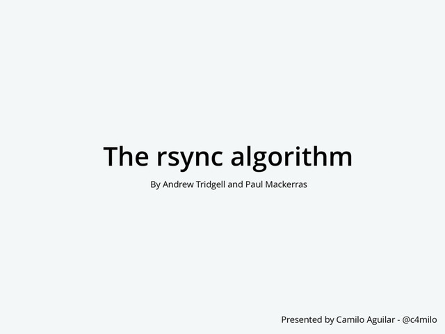 Modern computers are very powerful. These days, mobile phones are packed with multi core CPUs and even GPUs. Despite these advances in hardware, internet connections in most parts of the world are still surprisingly slow and unreliable. This creates a challenge: how can files be efficiently transferred between computers over a low-bandwidth, high latency network connection? In 1996, Andrew Tridgell and Paul Mackerras developed a simple solution which powers one of the most useful UNIX tools, rsync. The algorithm remains relevant 21 years after its invention because it solves a timeless problem.