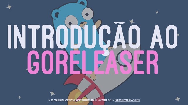 faz build e release the software escrito em Go > você configura uma vez via yaml > e faz uma release quando quiser com git tag + goreleaser release 3 — Go Community Monthly @ Hacktoberfest Brasil - October, 2021 - carlosbecker.dev/talks/