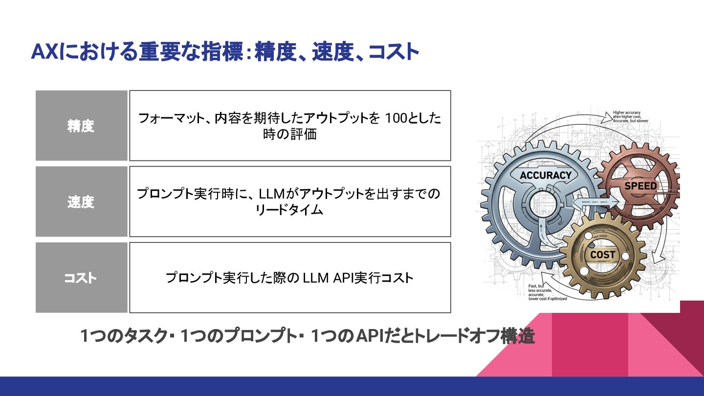 AXにおける重要な指標:精度、速度、コスト 精度 フォーマット、内容を期待したアウトプットを 100とした 時の評価 速度 プロンプト実行時に、 LLMがアウトプットを出すまでの リードタイム コスト