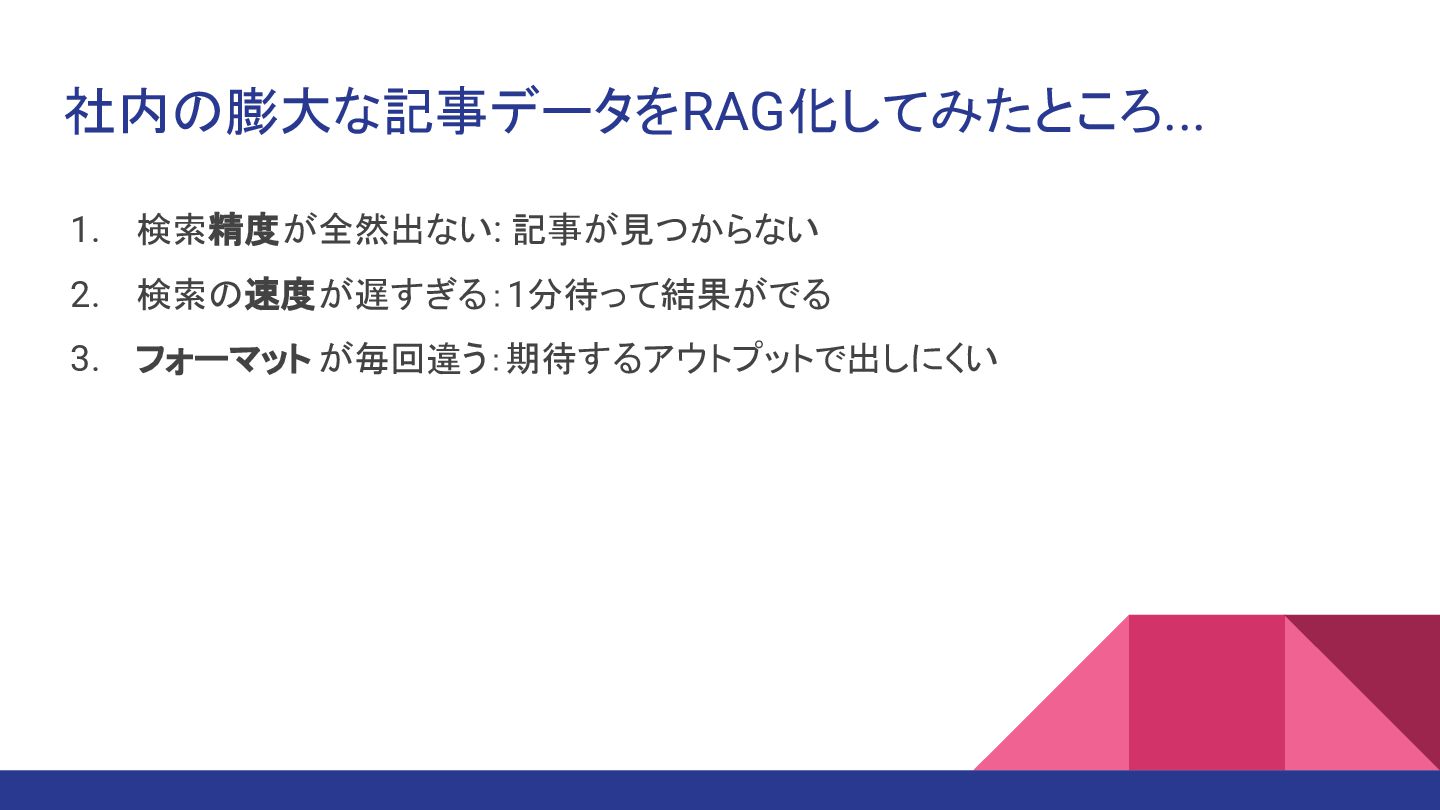 社内の膨大な記事データをRAG化してみたところ... 1. 検索精度が全然出ない: 記事が見つからない 2. 検索の速度が遅すぎる:1分待って結果がでる 3. フォーマット が毎回違う:期待するアウトプットで出しにくい