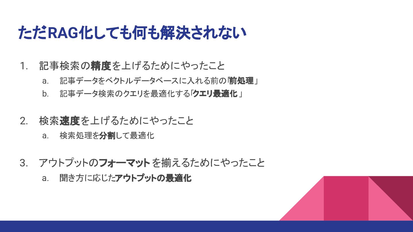 ただRAG化しても何も解決されない 1. 記事検索の精度を上げるためにやったこと a. 記事データをベクトルデータベースに入れる前の「 前処理」 b. 記事データ検索のクエリを最適化する「 クエリ最適化」 2.