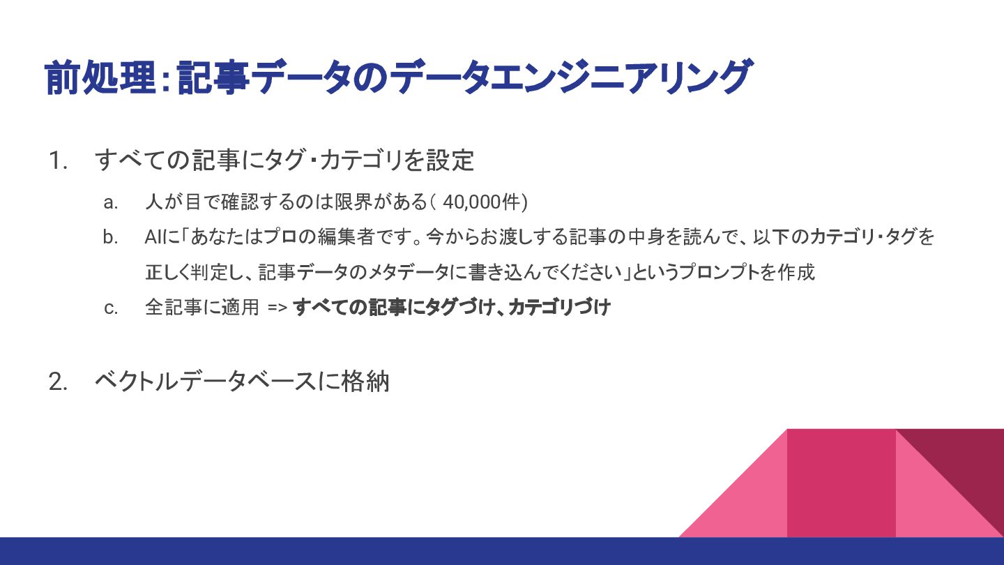 前処理:記事データのデータエンジニアリング 1. すべての記事にタグ・カテゴリを設定 a. 人が目で確認するのは限界がある( 40,000件) b. AIに「あなたはプロの編集者です。今からお渡しする記事の中身を読んで、以下のカテゴリ・タグを 正しく判定し、記事データのメタデータに書き込んでください」というプロンプトを作成 c.