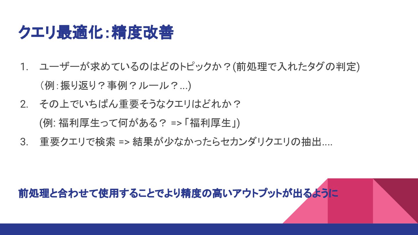 1. ユーザーが求めているのはどのトピックか?(前処理で入れたタグの判定) (例:振り返り?事例?ルール?...) 2. その上でいちばん重要そうなクエリはどれか? (例: 福利厚生って何がある? => 「福利厚生」) 3.