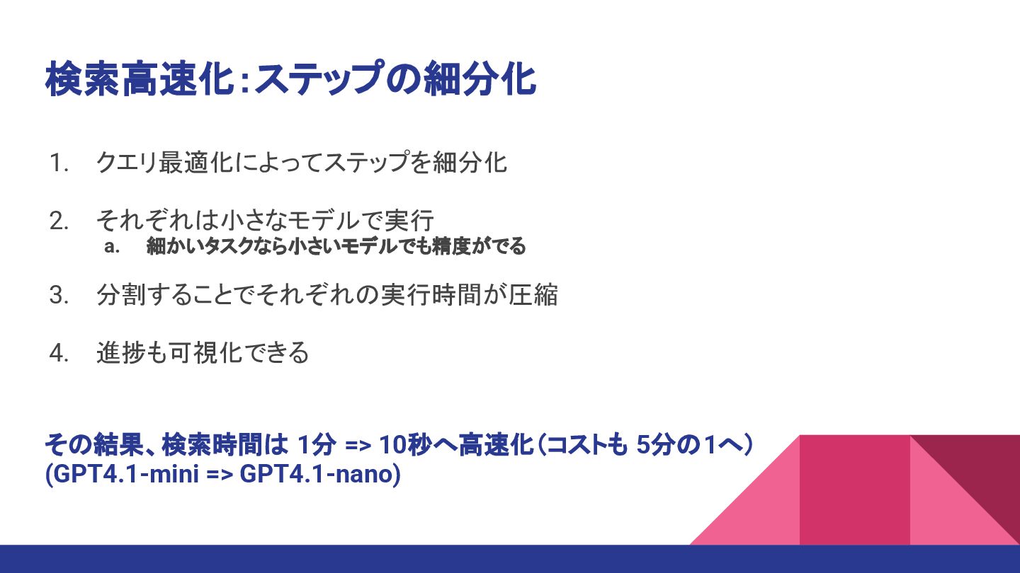 検索高速化:ステップの細分化 1. クエリ最適化によってステップを細分化 2. それぞれは小さなモデルで実行 a. 細かいタスクなら小さいモデルでも精度がでる 3. 分割することでそれぞれの実行時間が圧縮 4.