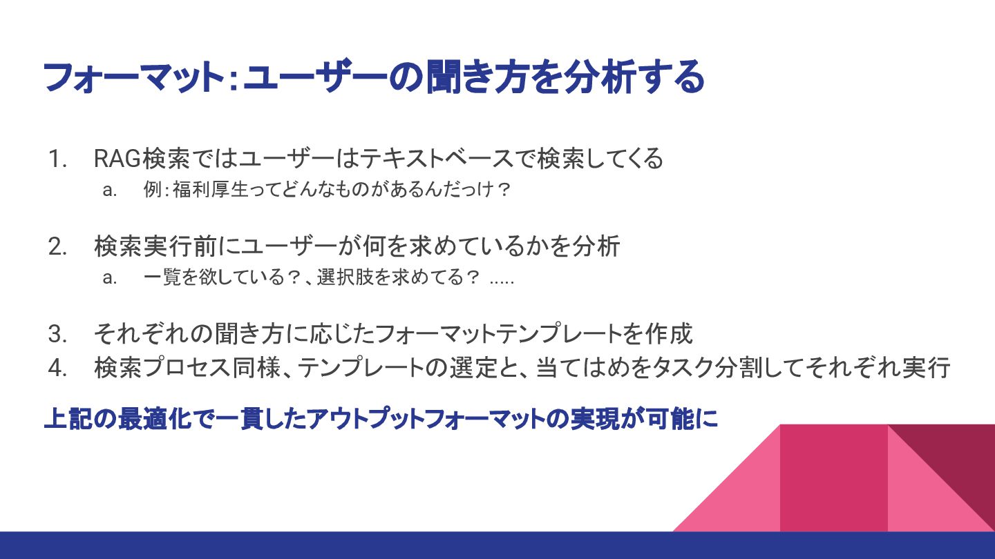 それぞれの聞き方に応じたフォーマットテンプレートを作成 4. 検索プロセス同様、テンプレートの選定と、当てはめをタスク分割してそれぞれ実行 上記の最適化で一貫したアウトプットフォーマットの実現が可能に フォーマット:ユーザーの聞き方を分析する